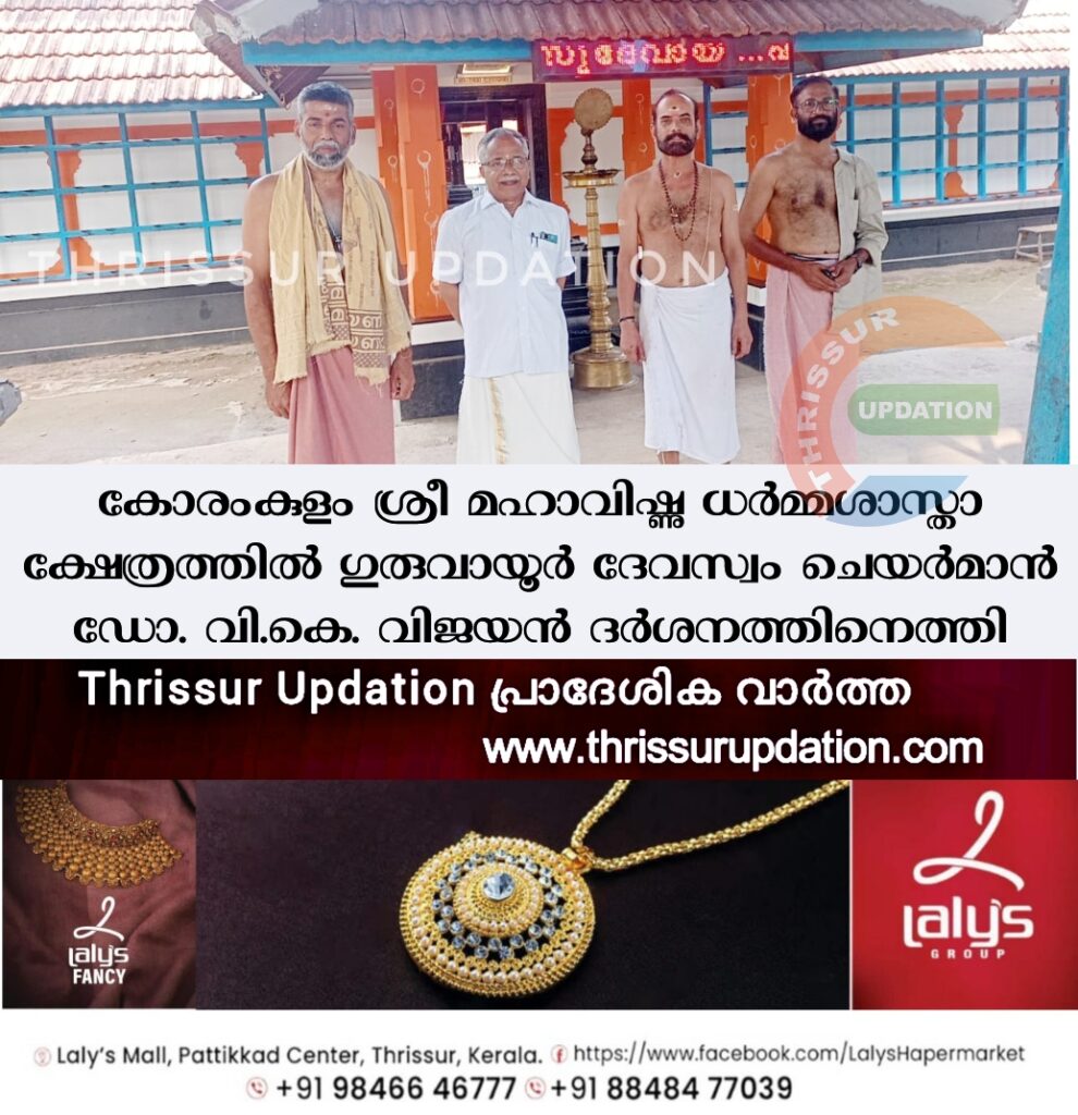 ഗുരുവായൂർ ദേവസ്വം ചെയർമാൻ ഡോ. വി.കെ. വിജയൻ കോരംകുളം ശ്രീ മഹാവിഷ്ണു ധർമ്മശാസ്താ ക്ഷേത്രത്തിൽ ദർശനത്തിനെത്തി. ക്ഷേത്രത്തിൽ നടക്കുന്ന പുനരുദ്ധാരണ പ്രവർത്തനങ്ങൾ നേരിട്ട് കണ്ട് മനസിലാക്കുകയും സെക്രട്ടറി എൻ.എസ്. പീതാംബരൻ ക്ഷേത്രത്തിൽ നടന്നുകൊണ്ടിരിക്കുന്ന പ്രവർത്തനങ്ങളെ കുറിച്ച് വിശദീകരിക്കുകയും ചെയ്തു. ചെയർമാൻ ഡോ. വി.കെ. വിജയൻ ദേവസ്വത്തിൽ നിന്നുള്ള ധനസഹായത്തിന് പരിഗണിക്കാമെന്ന് പറഞ്ഞു