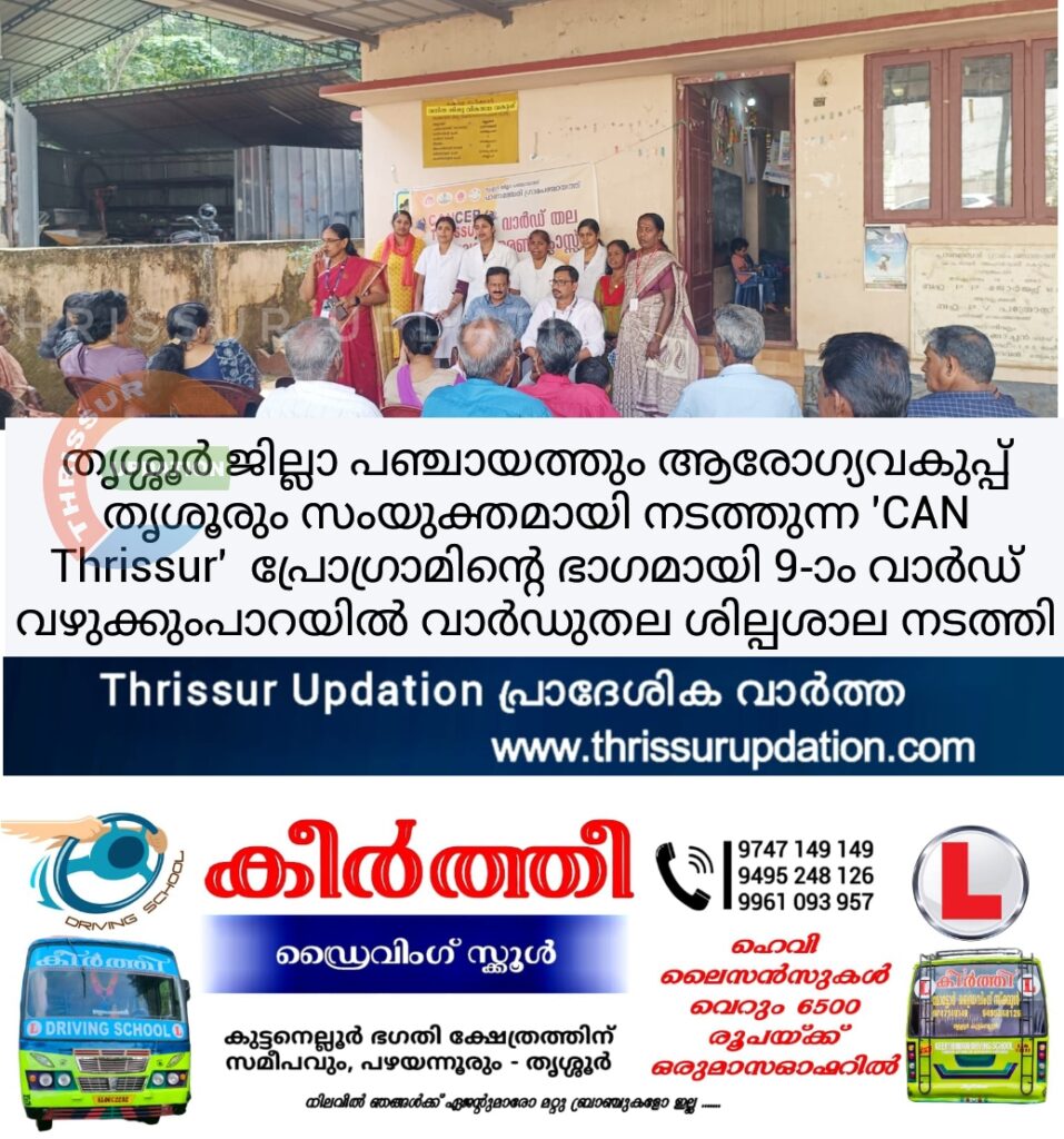 തൃശ്ശൂർ ജില്ലാ പഞ്ചായത്തും ആരോഗ്യവകുപ്പ് തൃശൂരും സംയുക്തമായി നടത്തുന്ന ‘CAN Thrissur (ക്യാൻസർ നിർണയ ചികിത്സാ പരിപാടി) പ്രോഗ്രാമിന്റെ ഭാഗമായി പാണഞ്ചേരി ഗ്രാമപഞ്ചായത്ത് ഒമ്പതാം വാർഡ് വഴക്കുംപാറയിൽ വാർഡുതല ശില്പശാല കുടുംബശ്രീയുടെ സഹകരണത്തോടെ നടത്തി. ശില്പശാലയിൽ വാർഡ് മെമ്പർ ചാക്കോച്ചൻ അധ്യക്ഷത വഹിച്ചു . ജൂനിയർ ഹെൽത്ത് ഇൻസ്പെക്ടർ സ്വാഗതം പറയുകയും CAN Thrissur പ്രോഗ്രാമിനെക്കുറിച്ച് വിശദീകരിക്കുകയും ചെയ്തു. വാണിയമ്പാറ കുടുംബാരോഗ്യ കേന്ദ്രം മെഡിക്കൽ ഓഫീസർ ഡോക്ടർ ബിന്ദു ക്യാൻസറിനെ കുറിച്ച് വിശദമായി ക്ലാസ്സെടുത്തു . പരിപാടിയിൽ വാണിയമ്പാറ കുടുംബാരോഗ്യ കേന്ദ്രം JPHN മാരായ മിനി , ഷിജി MLSP മാരായ ലിനി , സന്ധ്യ , ആശവർക്കർമാരായ ബിന്ദു , ഷീല എന്നിവർ പങ്കെടുത്തു