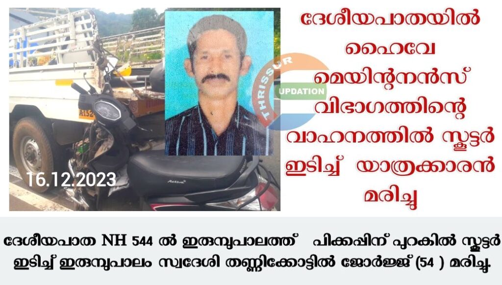 ദേശീയപാതയിൽ സ്ഥാപിക്കുന്നതിനായി ദിശാബോർഡുകൾ കൊണ്ടുപോകുന്ന വാഹനത്തിന് പിറകിലാണ് സ്കൂട്ടർ ഇടിച്ചു കയറിയത്. ദേശീയപാതയിൽ നിർത്തിയിട്ടിരുന്ന പിക്കപ്പ് വാനിന് പുറകിൽ അപകടമുന്നറിയിപ്പ് ബോർഡുകളോ സുരക്ഷാ ബാരിയറുകളോ സ്ഥാപിച്ചിരുന്നില്ല. ഇതാണ് അപകട കാരണമെന്ന് നാട്ടുകാർ പറഞ്ഞു.മരിച്ച ഇരുമ്പുപാലം സ്വദേശി ജോർജ്ജിന്റെ സംസ്ക്കാര ചടങ്ങുകൾ നാളെ ( 17.12.2023 ഞായറാഴ്ച ) 4.00 മണിക്ക് കൊമ്പഴ സെന്റ് ഗ്രീഗോറിയോസ് ഓർത്തഡോക്സ് പള്ളിയിൽ .