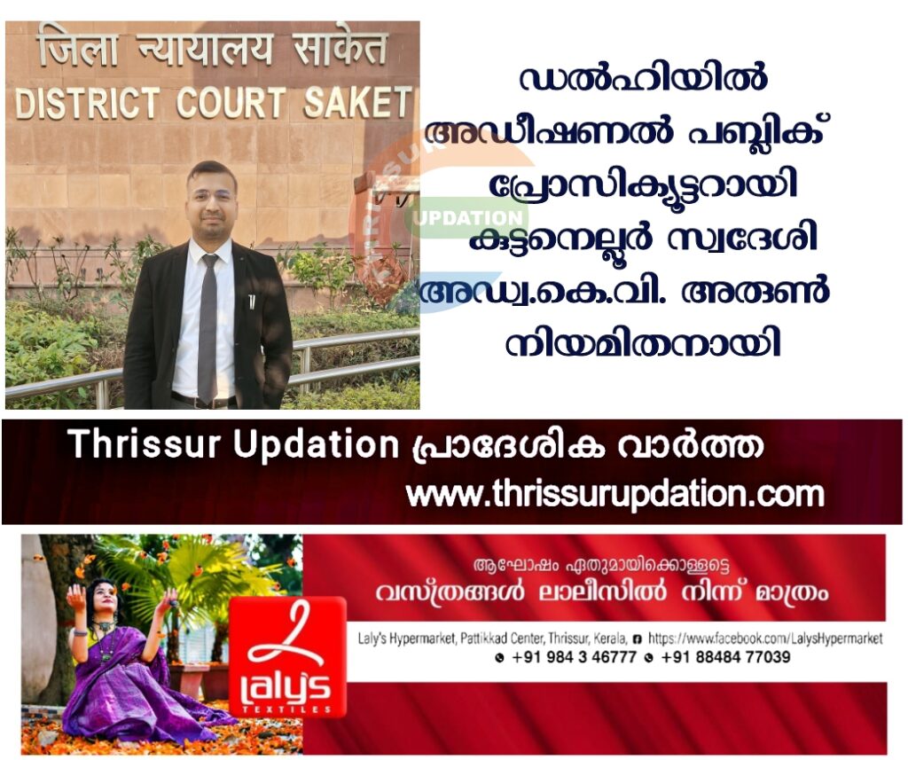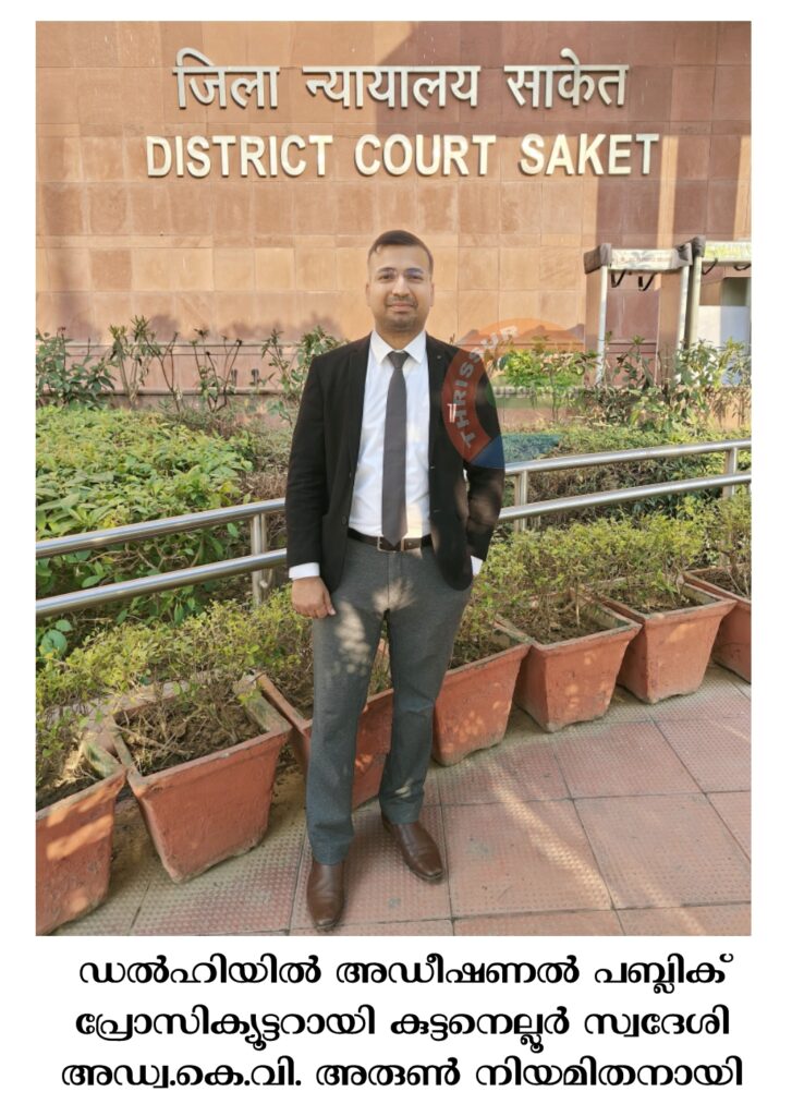 ഡൽഹി സർക്കാർ അഡീഷണൽ പബ്ലിക് പ്രോസിക്യൂട്ടറായി തൃശ്ശൂർ കുട്ടനെല്ലൂർ സ്വദേശി അഡ്വക്കേറ്റ് അരുൺ കെ. വി നിയമിതനായി. ദില്ലി ഗവർണർ വി കെ സക്സേന അംഗീകരിച്ച 13 അഡീഷണൽ പബ്ലിക് പ്രോസിക്യൂട്ടർമാരുടെ പ്രമോഷൻ ലിസ്റ്റിൽ ഉൾപ്പെട്ട ഏക മലയാളിയാണ് അഡ്വക്കേറ്റ് അരുൺ കെ വി.