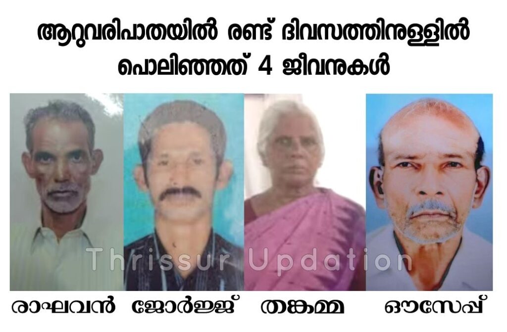 ആറുവരിപാത NH 544 മണ്ണുത്തി – വടക്കഞ്ചേരി ദേശീയപാതയിൽ 2 ദിവസത്തിനുള്ളിൽ മരിച്ചത് 4 പേർ . വെള്ളി രാത്രി 8.30നായിരുന്നു ആദ്യം ഉണ്ടായ അപകടത്തിൽ വയോധികന് മരിച്ചു.