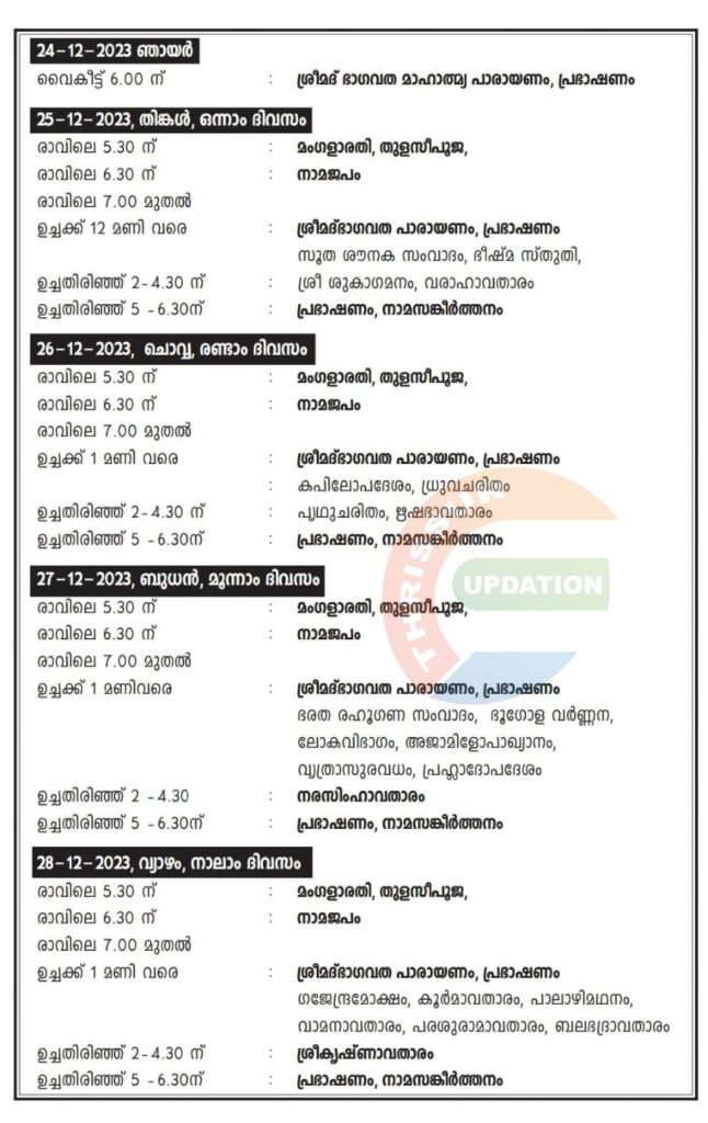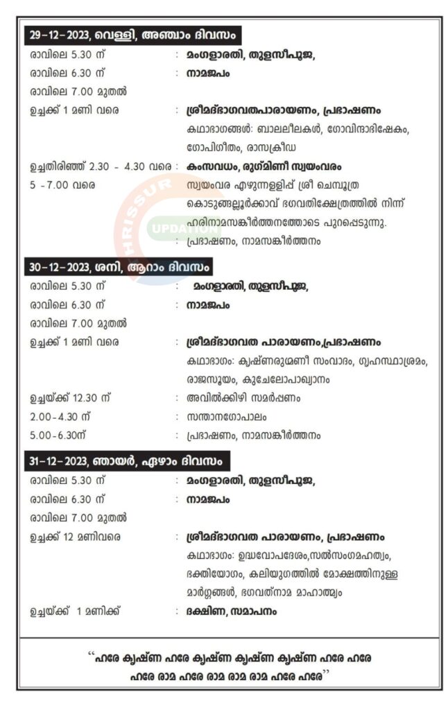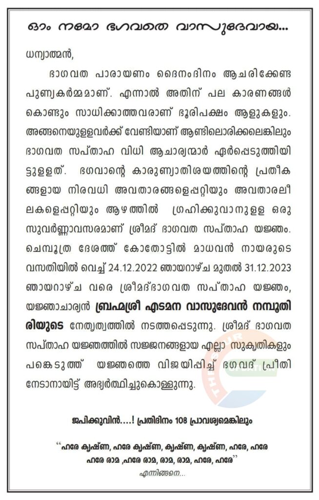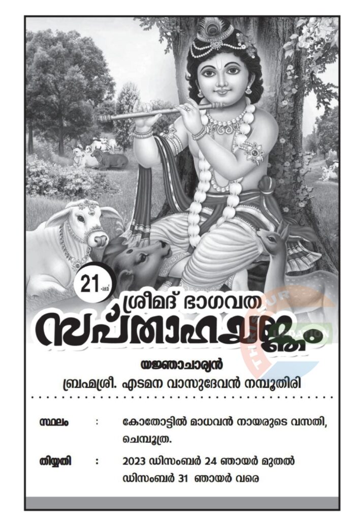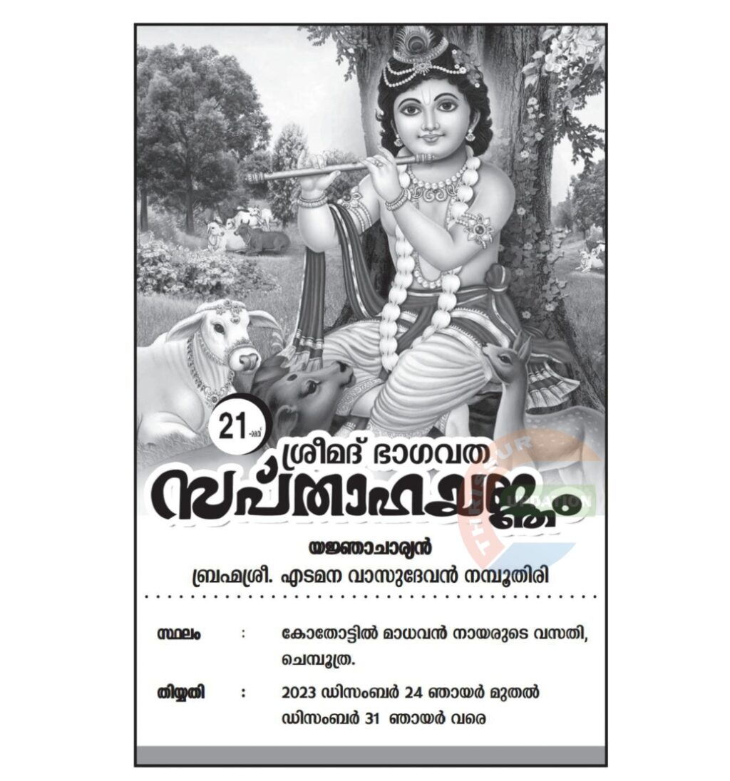 21-ാം മത് ശ്രീമദ് ഭാഗവത സപ്താഹ യജ്ഞം യജ്ഞാചാര്യൻ ബ്രഹ്മശ്രീ എടമന വാസുദേവൻ നമ്പൂതിരിയുടെ നേതൃത്വത്തിൽ 2023 ഡിസംബർ 24 ഞായറാഴ്ച മുതൽ ഡിസംബർ 31 ഞായറാഴ്ച വരെ ചെമ്പൂത്ര കോതോട്ടിൽ മാധവൻ നായരുടെ വസതിയിൽ വെച്ച് നടത്തപ്പെടുന്നു.