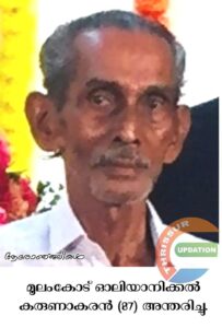 മൂലംകോട് ഓലിയാനിക്കൽ കരുണാകരൻ (87) അന്തരിച്ചു. സംസ്കാരം ഇന്ന് ( 27.12.2023 ബുധനാഴ്ച) രാവിലെ 11ന് വടക്കുംപാടം ആത്മാലയത്തിൽ.ഭാര്യ: പരേതയായ സാവിത്രി. മക്കൾ: വിജയൻ, സുമോൻ, ലാൽ, അനിൽ, പരേതനായ സന്തോഷ്. മരുമക്കൾ: ബിന്ദു, വിശാലം, ശ്രീജ, പരേതയായ ജിഷ, ആശ.