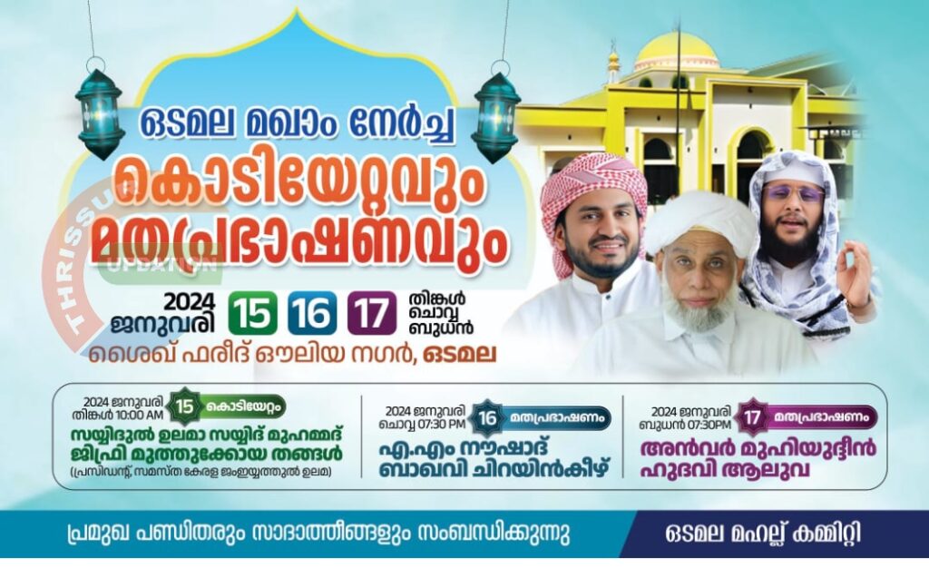 ഒടമല മഹല്ല് മുദരിസ് ശരീഫ് ഫൈസി കാരക്കാട് അധ്യക്ഷത വഹിക്കും.