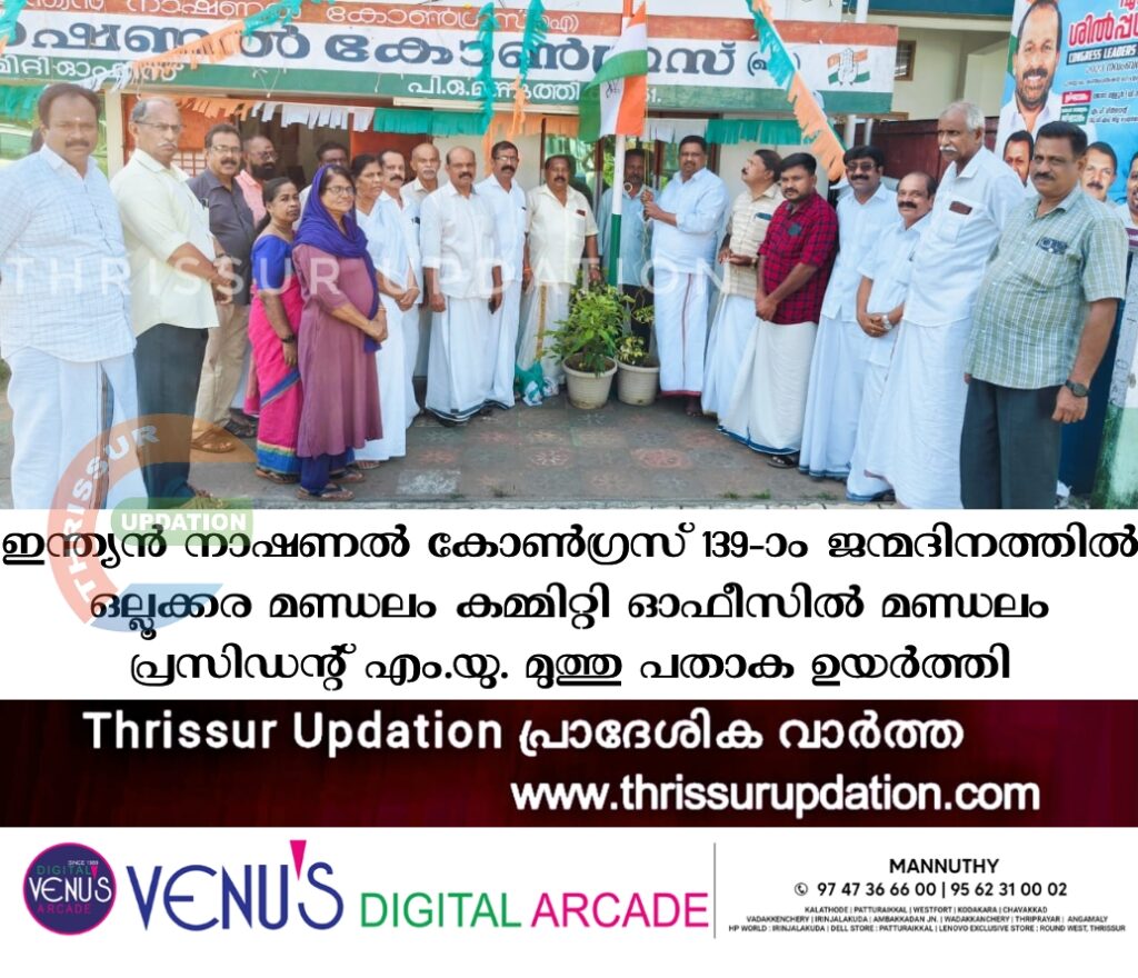 ഇന്ത്യൻ നാഷണൽ കോൺഗ്രസ് 139-ാം ജൻമദിനത്തിൽ ഒല്ലൂക്കര മണ്ഡലം കമ്മിറ്റി ഓഫീസിൽ മണ്ഡലം പ്രസിഡന്റ് എം.യു. മുത്തു പതാക ഉയർത്തുകയും