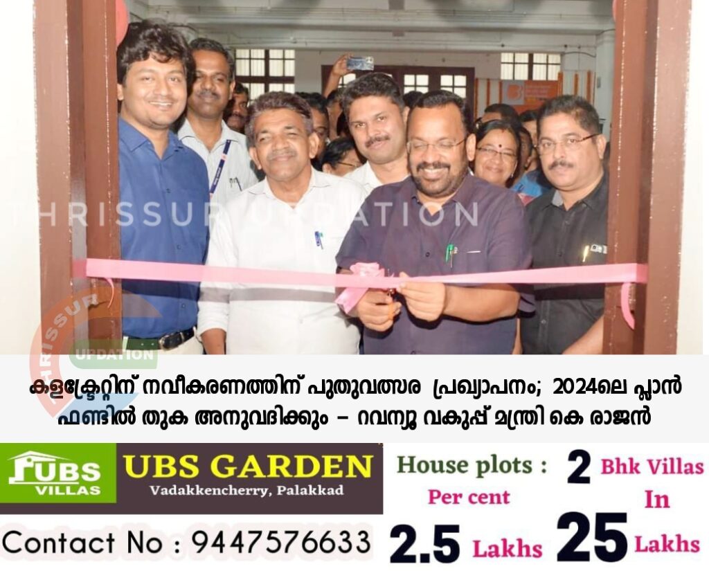 പുതുവത്സര സമ്മാനമായി തൃശൂർ കളക്ട്രേറ്റ് നവീകരണത്തിന് 2024ലെ പ്ലാൻ ഫണ്ടിൽ തുക അനുവദിക്കുമെന്ന് റവന്യൂ വകുപ്പ് മന്ത്രി കെ രാജൻ. കളക്ടറേറ്റിലെ നവീകരിച്ച പി ജി ആർ സെൽ, ഔഷധ സസ്യോദ്യാനം എന്നിവയുടെയും എടിഎമ്മിന്റെ സമര്പ്പണവും ക്ലീന് ഗ്രീന് സിവില് സ്റ്റേഷന് പ്രഖ്യാപനവും നിർവഹിച്ച് സംസാരിക്കുകയായിരുന്നു മന്ത്രി.