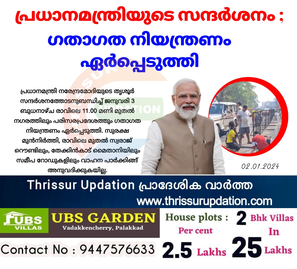 പ്രധാനമന്ത്രി നരേന്ദ്രമോദിയുടെ തൃശൂർ സന്ദർശനത്തോടനുബന്ധിച്ച് ജനുവരി 3 ബുധനാഴ്ച രാവിലെ 11.00 മണി മുതൽ നഗരത്തിലും പരിസരപ്രദേശത്തും ഗതാഗത നിയന്ത്രണം ഏർപ്പെടുത്തി. സുരക്ഷ മുൻനിർത്തി, രാവിലെ മുതൽ സ്വരാജ് റൌണ്ടിലും, തേക്കിൻകാട് മൈതാനിയിലും സമീപ റോഡുകളിലും വാഹന പാർക്കിങ്ങ് അനുവദിക്കുകയില്ല. കെഎസ്ആർടിസി ഉൾപ്പെടെയുള്ള പൊതുഗതാഗത വാഹനങ്ങൾ സ്വരാജ് റൌണ്ടിൽ പ്രവേശിപ്പിക്കാതെ വഴിതിരിച്ചുവിടുന്നതാണ്. റെയിൽവേ സ്റ്റേഷൻ, എയർപോർട്ട് എന്നിവിടങ്ങളിലേക്ക് പോകുന്നവരും വിവിധ പരീക്ഷ കേന്ദ്രങ്ങളിലേക്ക് വരുന്നവരും നഗരത്തിൽ ഗതാഗത നിയന്ത്രണം ഏർപ്പെടുത്തിയിരിക്കുന്ന വിവരം മുൻകൂട്ടി മനസ്സിലാക്കി പ്രവർത്തിക്കേണ്ടതാണ്.