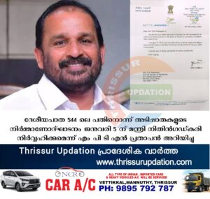 ജനുവരി അഞ്ചിന് കാസർഗോഡ് വെച്ച് നടക്കുന്ന സംസ്ഥാനത്തെ വിവിധ ദേശീയപാത പദ്ധതികളുടെ നിർമ്മാണോദ്ഘാടനചടങ്ങിൽ വെച്ച് തൃശ്ശൂർ പാർലിമെന്റ് മണ്ഡലത്തിലെ മുടിക്കോട്, കല്ലിടുക്ക്, വാണിയമ്പാറ, ആമ്പല്ലൂർ അടിപ്പാതകളും ആലത്തൂർ മണ്ഡലത്തിലെ ആലത്തൂർ, കുഴൽമന്ദം അടിപ്പാതകളും ചാലക്കുടി മണ്ഡലത്തിലെ ചിറങ്ങര , കൊരട്ടി , മുരിങ്ങൂർ,പേരാമ്പ്ര അടിപ്പാതകളും പാലക്കാട് മണ്ഡലത്തിലെ കാഴിച്ചപ്പറമ്പ് അടിപ്പാതയും കേന്ദ്ര ഉപരിതല ഗതാഗതവകുപ്പ് മന്ത്രി നിതിൻ ഗഡ്കരി നിർമ്മാണോദ്ഘാടനം നിർവ്വഹിക്കുമെന്ന് ടി.എൻ.പ്രതാപൻ എംപി അറിയിച്ചു. പ്രസ്തുത ചടങ്ങിലേക്ക് ഈ പ്രദേശങ്ങളിലെ എംപിമാർക്ക് പ്രത്യേക ക്ഷണം മന്ത്രിയിൽ നിന്നും ലഭിച്ചിട്ടുണ്ട്. തൃശ്ശൂർ പാർലിമെന്റ് മണ്ഡലത്തിലെ അടിപ്പാതകൾക്ക് 209.17 കോടി രൂപയും ആലത്തൂരിൽ 117.77 കോടി രൂപയും ചാലക്കുടിയിൽ 149.45 കോടി രൂപയും പാലക്കാട് 49.40 കോടി രൂപയും അടക്കം ആകെ 525.79 കോടി രൂപയുടെ പദ്ധതികളാണ് ദേശീയ പാത 544 ൽ മന്ത്രി ഉദ്ഘാടനം നിർവ്വഹിക്കുന്നത്. ഇതി സംബന്ധിച്ച ഔദ്യോഗിക അറിയിപ്പ് കേന്ദ്ര മന്ത്രിയിൽ നിന്നും ലഭിച്ചതായി ടി.എൻ.പ്രതാപൻ എംപി അറിയിച്ചു. കഴിഞ്ഞ ദിവസം ടെണ്ടർ നടപടികളുടെ പ്രഥമഘട്ടം പൂർത്തിയാക്കിയ അടിപ്പാതകളുടെ വാല്യുവേഷൻ നടപടികൾ ഒരു മാസത്തിനുള്ളിൽ പൂർത്തിയാക്കും . അതിന് ശേഷമായിരിക്കും നിർമ്മാണ പ്രവർത്തികൾ ആരംഭിക്കുക. അടിപ്പാത നിർമ്മാണത്തിനായി മത്സരാടിസ്ഥാനത്തിൽ നടന്ന ടെണ്ടറിൽ ഏഴ് കമ്പനികളാണ് പങ്കെടുത്തിട്ടുള്ളത്. നിരന്തരം അപകടങ്ങളുണ്ടാകുന്ന മേൽ സൂചിപ്പിച്ച പ്രദേശങ്ങളിൽ അടിപ്പാത യാഥാർത്ഥ്യ മാക്കുന്നതിന് വലിയ ജനകീയ പ്രക്ഷോഭങ്ങൾ നടന്നു വരികയായിരുന്നു. പാർലിമന്റിനകത്തും പുറത്തും കേന്ദ്ര ഉപരിതല ഗതാഗത വകുപ്പ് മന്ത്രിയുടെ അടുത്ത് നിരന്തരമായി നടത്തിയ സമ്മർദ്ദത്തിന്റെ ഫലമായാണ് അടിപ്പാതകൾക്ക് അനുമതി ലഭിച്ചതെന്ന് ടി.എൻ. പ്രതാപൻ എംപി അറിയിച്ചു. ഇക്കാര്യത്തിൽ കേന്ദ്ര ഉപരിതല ഗതാഗത വകുപ്പ് മന്ത്രി നിതിൻ ഗഡ്കരിക്ക് പ്രത്യേകം നന്ദി അറിയിച്ച് ടി.എൻ. പ്രതാപൻ എംപി കത്ത് നൽകി.