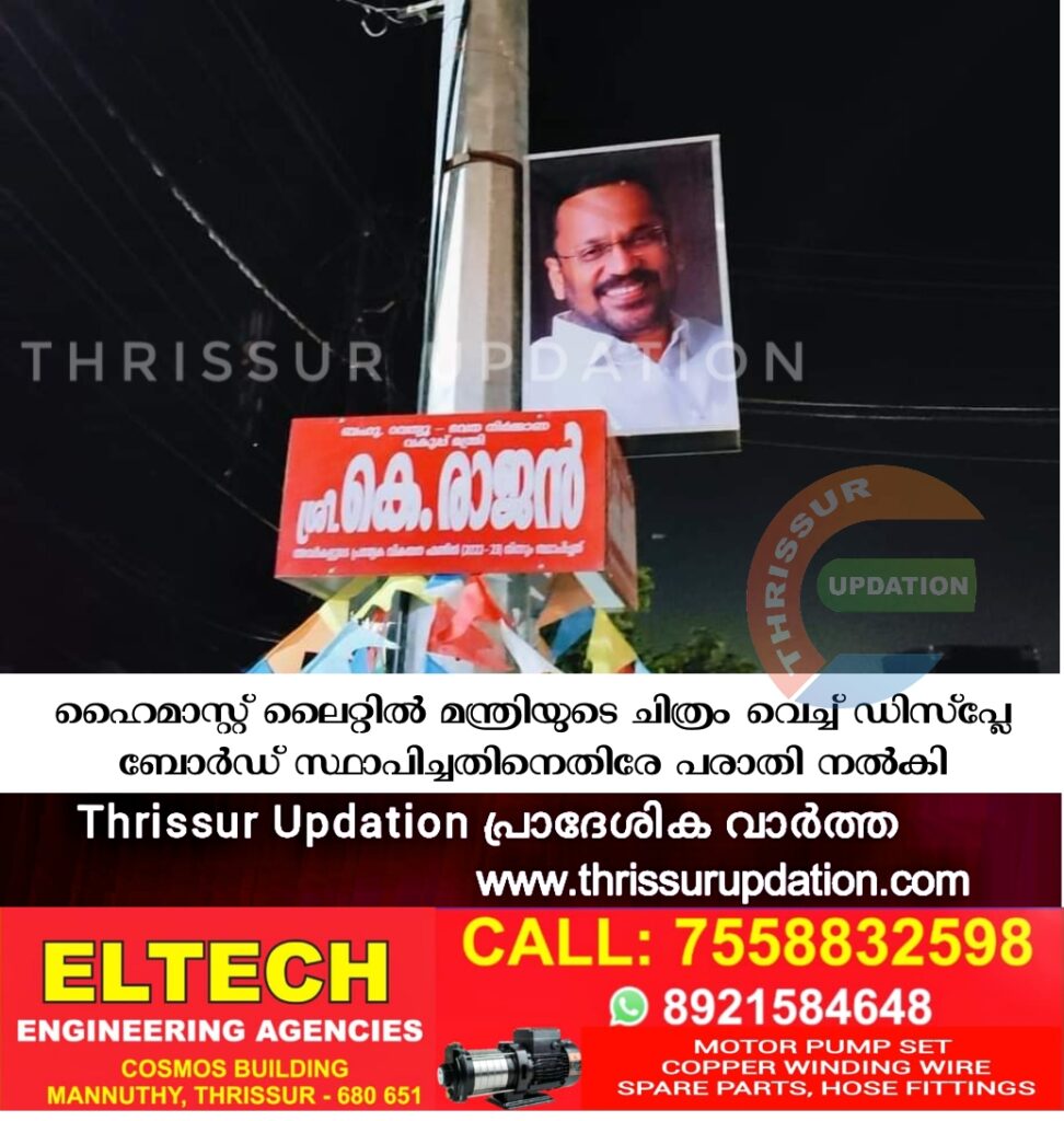 ദേശീയപാതയോരത്ത് ചെമ്പൂത്ര, മുടിക്കോട് എന്നിവിടങ്ങളിൽ സ്ഥാപിച്ച ഹൈമാസ്റ്റ് ലൈറ്റിൽ റവന്യൂ മന്ത്രി കെ. രാജന്റെ ചിത്രംവെച്ച് ഡിസ്പ്ലേ ബോർഡ് സ്ഥാപിച്ചതിനെതിരേ ജില്ലാ കളക്ടർക്ക് പരാതി. കെ.പി.സി.സി. സെക്രട്ടറി ഷാജി. ജെ. കോടങ്കണ്ടത്താണ് പരാതി നൽകിയത്.
