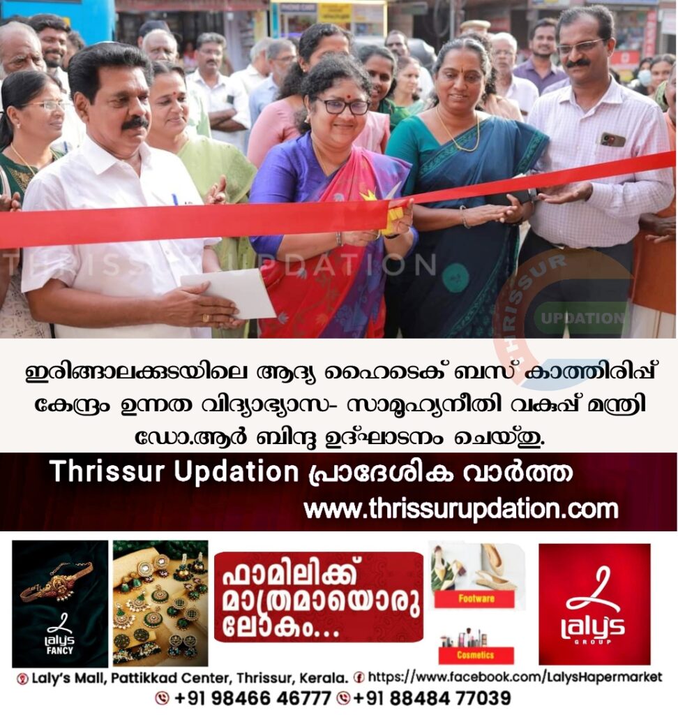 ഇരിങ്ങാലക്കുട സെന്ററിനോട് ചേർന്ന് താലൂക്ക് ഹോസ്പിറ്റലിന്റെ മുൻവശത്താണ് ആധുനിക സൗകര്യത്തോടുകൂടി ബസ് വെയിറ്റിംഗ് ഷെഡ് നിർമ്മിച്ചിരിക്കുന്നത്. വൈഫെ സൗകര്യം, സോളാര് സിസ്റ്റം, റൂഫീങ്ങ് ലെറ്റുകള്, മ്യൂസിക്ക് സിസ്റ്റം, നീരിക്ഷണ ക്യാമറ, മൊബൈല് ചാര്ജ്ജിങ് പോര്ട്ടുകള് തുടങ്ങി ബുക്ക് ഷെല്ഫ് വരെ സജ്ജമാക്കിയിട്ടുണ്ട്. വെള്ളാങ്കല്ലൂര് ബ്ലോക്ക് പഞ്ചായത്തംഗം രാജേഷ് അശോകന്റെ നേതൃത്വത്തില് ഇരിങ്ങാലക്കുടയിലെ ആരാധനാലയങ്ങളും പുരാതന കലാരൂപങ്ങളും ബസ് സ്റ്റോപ്പിൽ ചിത്രീകരിച്ചിട്ടുണ്ട്.