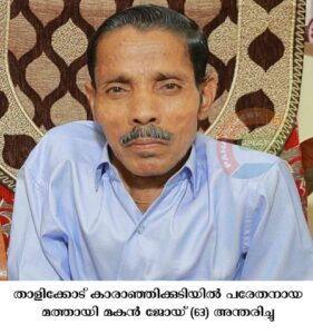 താളിക്കോട് കാരാഞ്ഞിക്കുടിയിൽ പരേതനായ മത്തായി മകൻ ജോയ് (63) അന്തരിച്ചു. സംസ്കാരം നാളെ (11.01.2024) വൈകിട്ട് 4 ന് കരിപ്പക്കുന്ന് സെമിത്തേരിയിൽ. മാതാവ്: ശോശാമ്മ. സഹോദരങ്ങൾ: ചെറിയാൻ, സണ്ണി, എൽസി, മേരിക്കുട്ടി.