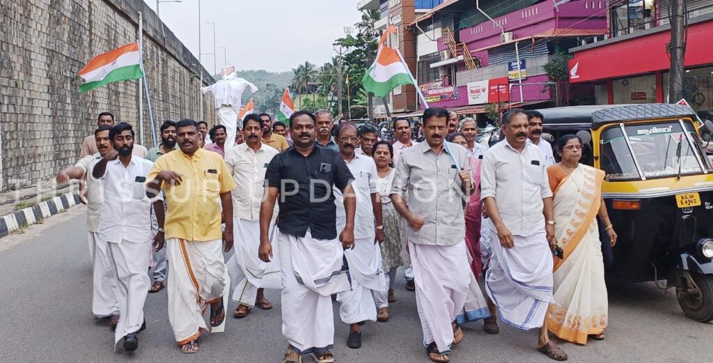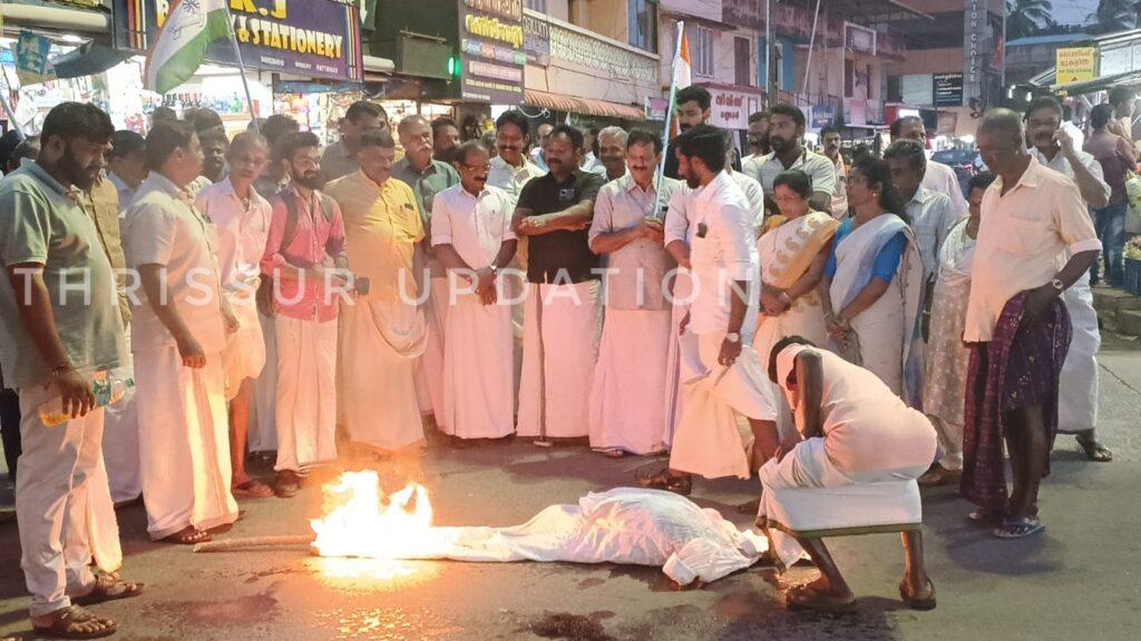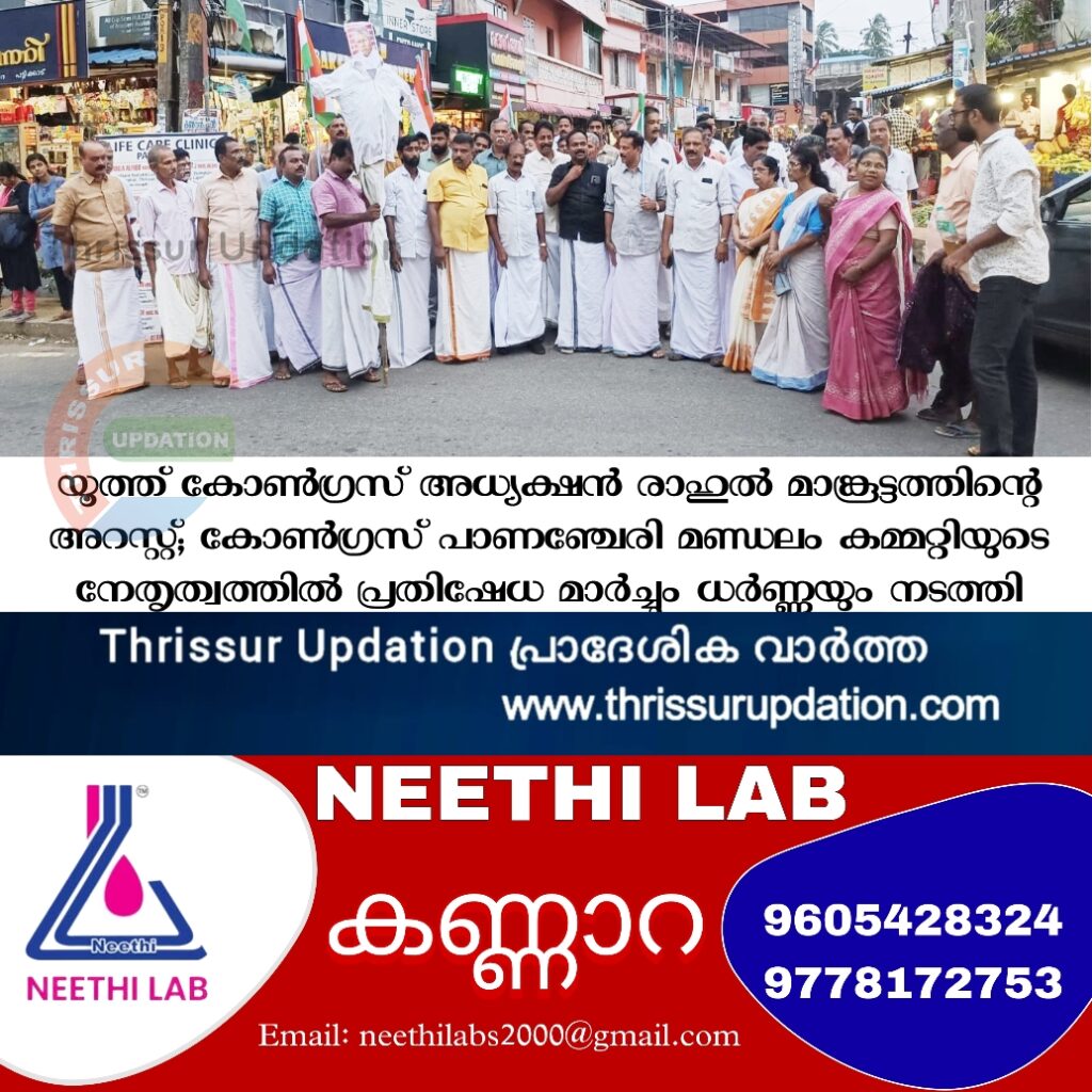 ജനാധിപത്യരീതിയിൽ സെക്രട്ടറിയേറ്റിലേക്ക് പ്രതിഷേധ മാർച്ച് നടത്തിയ യൂത്ത് കോൺഗ്രസ് അധ്യക്ഷൻ രാഹുൽ മാങ്കൂട്ടത്തിനെ ക്രിമിനൽ കേസ് പ്രതിയെപ്പോലെ അറസ്റ്റ് ചെയ്ത് അപമാനിച്ചുയെന്ന് ആരോപിച്ച് കോൺഗ്രസ് പാണഞ്ചേരി മണ്ഡലം കമ്മറ്റി പ്രതിഷേധ മാർച്ചും ധർണയും നടത്തി. പട്ടിക്കാട് രാജീവ് ഭവനിൽ നിന്ന് ആരംഭിച്ച പ്രതിഷേധ മാർച്ച് പട്ടിക്കാട് സെന്ററിൽ വെച്ച് മുഖ്യമന്ത്രി പിണറായി വിജയന്റെ കോലം കത്തിച്ചു.പ്രതിഷേധ മാർച്ചിൽ മണ്ഡലം കോൺഗ്രസ് കമ്മിറ്റി പ്രസിഡന്റ് കെ .പി . ചാക്കോച്ചൻ അധ്യക്ഷത വഹിച്ച യോഗത്തിൽ കെ.പി.സി.സി. അംഗം ലീലാമ്മതോമസ് ഉദ്ഘാടനം നിർവഹിച്ചു.കെ .സി . അഭിലാഷ്, ഷിബു പോൾ, ബാബു തോമസ്, സുശീല രാജൻ ,ഷൈജു കുര്യൻ ,കെ . പി .എൽദോസ് ,ശ്രീജു .c.s അനിൽകുമാർ , ടി.വി. ജോൺ ,സി. കെ.ഷൺമുഖൻ, പ്രവീൺ രാജു ,ജിഫിൻ ജോയ് ,ബ്ലസൻ വർഗീസ്, വി.ബി ചന്ദ്രൻ എന്നിവർ സംസാരിച്ചു.ബ്ലോക്ക് , മണ്ഡലം, മഹിളാ കോൺഗ്രസ്, യൂത്ത് കോൺഗ്രസ്, ഐഎൻടിയുസി ഭാരവാഹികൾ പ ധർണയ്ക്ക് നേതൃത്വം നൽകി.