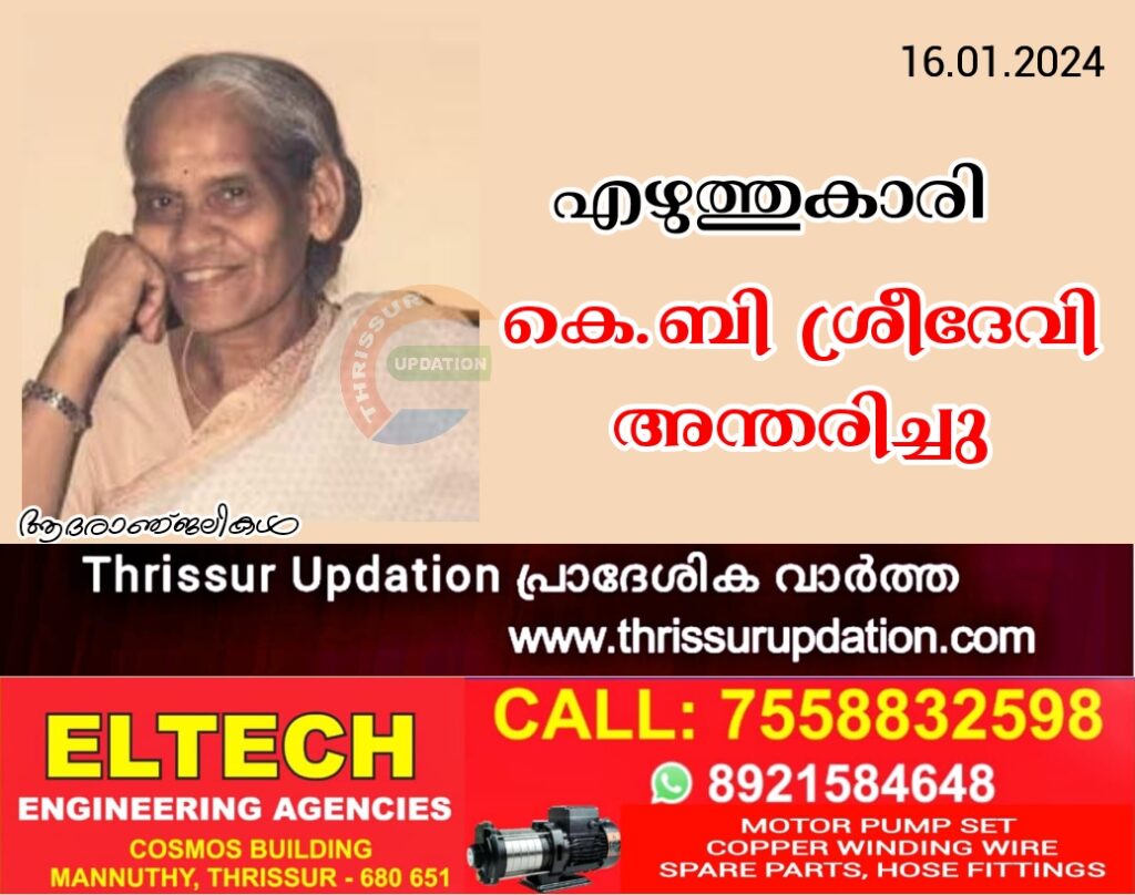 സാഹിത്യകാരി കെ.ബി. ശ്രീദേവി (84) അന്തരിച്ചു. വാര്ധക്യ സഹജമായ രോഗങ്ങളെ തുടര്ന്ന് തൃപ്പൂണിത്തുറയിലെ മകന്റെ വീട്ടിലായിരുന്നു അന്ത്യം. സംസ്കാരം ഇന്ന് വൈകീട്ട് നാലിന് നടക്കും. കഥ, നോവല്, പഠനം, ബാലസാഹിത്യം, നാടകം എന്നീ മേഖലകളില് പ്രതിഭ തെളിയിച്ച എഴുത്തുകാരിയാണ്.