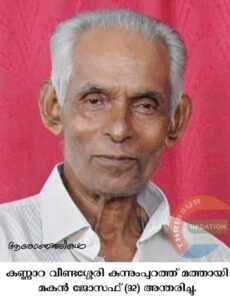 കണ്ണാറ വീണ്ടശ്ശേരി കുന്നുംപുറത്ത് മത്തായി മകൻ ജോസഫ് (92) അന്തരിച്ചു .സംസ്കാരം നാളെ (18.01.2024 വ്യാഴാഴ്ച) കാലത്ത് 11 മണിക്ക് വീണ്ടശ്ശേരി മേരി ഇമ്മാക്കുലേറ്റ് പള്ളിയിൽ .ഭാര്യ: പരേതയായ മേരിക്കുട്ടി. മക്കൾ: മാത്യു, ജോസ്, ഓമന, മോളി, ബെന്നി, സോജൻ. മരുമക്കൾ: റോസിലി, ജോളി, ജോസ്, റോയി, ജിജി, നിഷ.