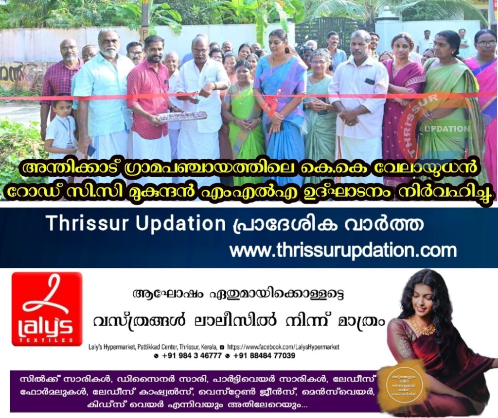 അന്തിക്കാട് ഗ്രാമപഞ്ചായത്ത് ഒന്നാം വാര്ഡിലെ കെ.കെ വേലായുധന് റോഡ് തുറന്നു. സി.സി മുകുന്ദന് എംഎല്എ റോഡ് ഉദ്ഘാടനം നിര്വഹിച്ചു. ഹാര്ബര് എഞ്ചിനീയറിംഗ് വകുപ്പിന്റെ തീരദേശ റോഡ് വികസനഫണ്ടില് നിന്ന് 27.7 ലക്ഷം രൂപ ഉപയോഗിച്ചാണ് നിര്മ്മാണം. ചടങ്ങില് അന്തിക്കാട് ഗ്രാമ പഞ്ചായത്ത് പ്രസിഡന്റ് ജ്യോതി രാമന് അധ്യക്ഷത വഹിച്ചു. അന്തിക്കാട് ബ്ലോക്ക് പഞ്ചായത്ത് പ്രസിഡന്റ് കെ.കെ ശശിധരന് മുഖ്യാതിഥിയായി. വാര്ഡ് മെമ്പര് മിനി ചന്ദ്രന്, ക്ഷേമകാര്യ സ്റ്റാന്ഡിങ് കമ്മിറ്റി ചെയര്മാന് ഷഫീര് പി.എ, വികസന സ്റ്റാന്ഡിങ്ങ് കമ്മിറ്റി ചെയര്പേഴ്സണ് മേനക ടീച്ചര്, ജനപ്രതിനിധികളായ കെ.കെ പ്രദീപ്, മില്ന സ്മിത്ത്, രഞ്ജിത്ത്കുമാര്, ജീന നന്ദന് തുടങ്ങിയവര് പങ്കെടുത്തു.
