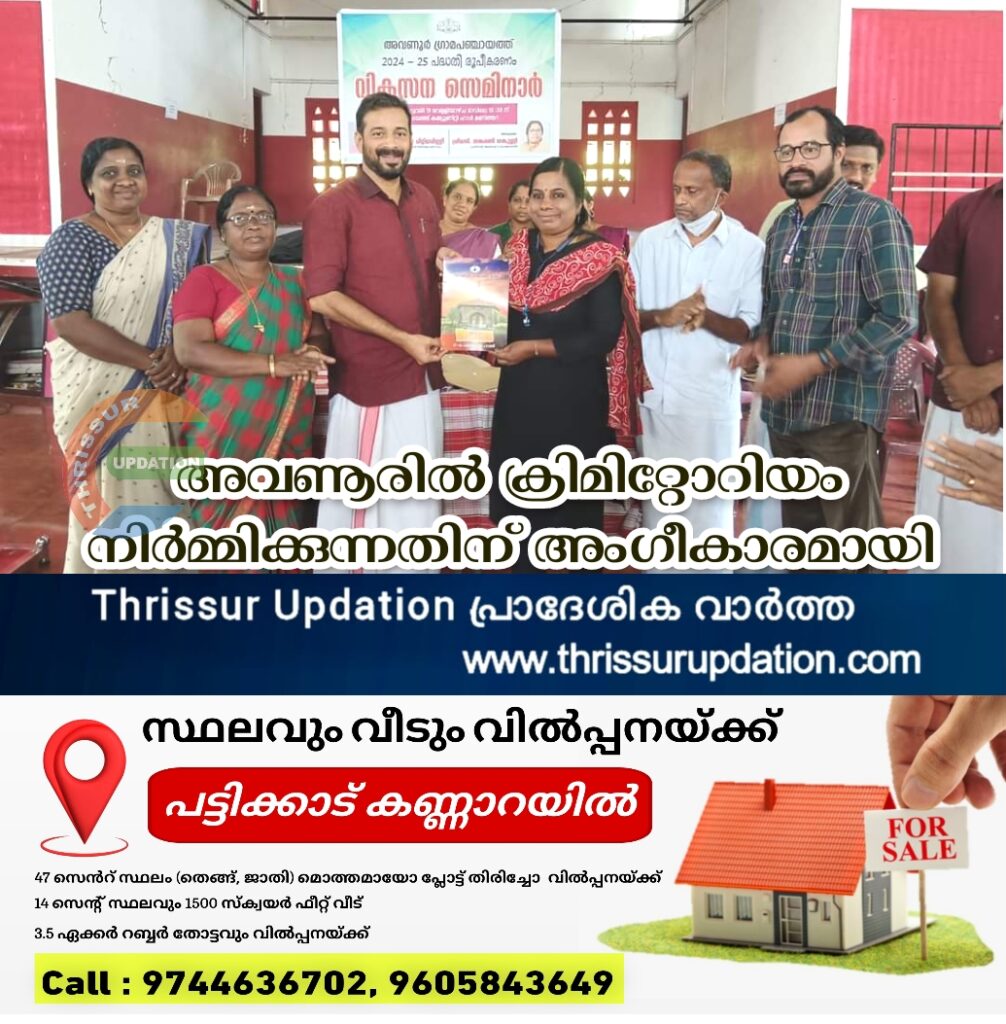 അവണൂര് ഗ്രാമപഞ്ചായത്തില് 50 ലക്ഷം രൂപ വിനിയോഗിച്ചു നിര്മ്മിക്കുന്ന ക്രിമിറ്റോറിയം ഉള്പ്പെടെയുള്ള വികസന പദ്ധതികള്ക്ക് വികസന സെമിനാറില് അംഗീകാരമായി. അവണൂര് ഗ്രാമപഞ്ചായത്തില് ചേര്ന്ന വികസന സെമിനാര് സേവ്യര് ചിറ്റിലപ്പിള്ളി എംഎല്എ ഉദ്ഘാടനം ചെയ്തു. പഞ്ചായത്ത് പ്രസിഡന്റ് തങ്കമണി ശങ്കുണ്ണി അദ്ധ്യക്ഷയായി. 2024-2025 വര്ഷത്തെ വികസന രേഖ എംഎല്എ ജില്ലാപഞ്ചായത്ത് മെമ്പര് ലിനി ടീച്ചര്ക്ക് നല്കി പ്രകാശനം ചെയ്തു. എംസിഎഫ് നവീകരണത്തിന് 8 ലക്ഷം രൂപയും, കുടുംബാരോഗ്യ അടിസ്ഥാന വികസനങ്ങള്, കൃഷിക്ക് ഊന്നല് നല്കിയുള്ള വികസന പ്രവര്ത്തനങ്ങള്, ചിറകളുടെ സംരക്ഷണം തുടങ്ങിയ സാമ്പത്തിക വര്ഷത്തില് 10 കോടി 50 ലക്ഷം രൂപയുടെ പദ്ധതിരേഖക്ക് അംഗീകാരമായി.