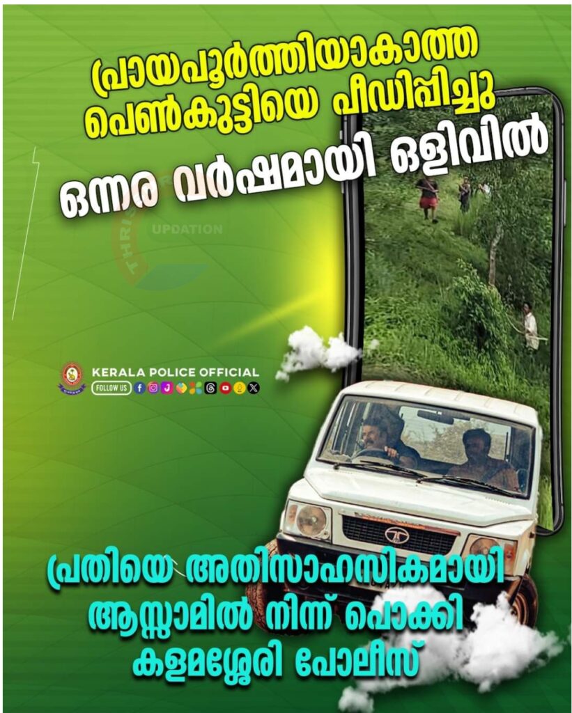 കളമശ്ശേരിയിൽ പ്രായപൂർത്തിയാകാത്ത പെൺകുട്ടിയെ പീഡിപ്പിച്ചു ഒന്നര വർഷമായി ആസാമിൽ ഒളിവിൽ കഴിഞ്ഞയാളെ കളമശ്ശേരി പോലീസ് ആസാമിൽ നിന്ന് പിടികൂടി.അപ്പർ ആസാം ദിമാജി ജില്ലയിൽ കാലിഹമാരി ഗ്രാമത്തിൽ രാത്തുൾ സൈക്കിയയുടെ മകൻ പുസാൻഡോ എന്ന് വിളിക്കുന്ന മഹേശ്വൻ സൈക്കിയയെയാണ് കളമശ്ശേരി പോലീസ് സാഹസികമായി അറസ്റ്റ് ചെയ്തത്.