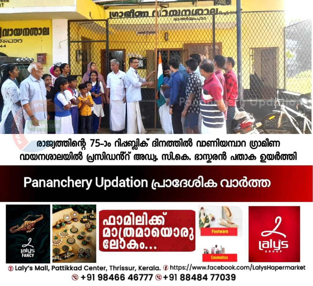 രാജ്യത്തിൻ്റെ 75-ാം റിപ്പബ്ലിക് ദിനത്തിൽ വാണിയമ്പാറ ഗ്രാമീണ വായനശാലയിൽ പ്രസിഡൻ്റ് അഡ്വ: സി.കെ. ഭാസ്കരൻ പതാക ഉയർത്തി.രാജ്യത്തിൻ്റെ ഭരണഘടന വിഭാവനം ചെയ്യുന്ന സമത്വത്തിലധിഷ്ഠിതമായ നീതി നിലനിർത്തപ്പെടാൻ പൗരസമൂഹം ജാഗ്രത പാലിക്കേണ്ടതുണ്ടെന്ന് ഗ്രാമീണ വായനശാല പ്രസിഡൻ്റ് അഡ്വ: സി.കെ. ഭാസ്കരൻ അഭിപ്രായപ്പെട്ടു. രാജ്യത്തിൻ്റെ 75-ാമത് റിപ്പബ്ലിക് ദിനത്തിൽ ദേശീയ പതാക ഉയർത്തിക്കൊണ്ട് സംസാരിക്കുകയായിരുന്നു അദ്ദേഹം. വൈസ് പ്രസിഡൻ്റ് സജിത ജയകുമാർ, സെക്രട്ടറി എം.എ. മൊയ്തീൻകുട്ടി, ജോ:സെക്രട്ടറി എം.എം. ഇബ്രാഹിം, ഭരണ സമിതി അംഗം സി.എ. ജമാൽ ലൈബ്രറേറിയൻ പി.എൻ. സേതുമാധവൻ, ശബ്നടീച്ചർ, ദീപസതീഷ്, രേഷ്മവിഷ്ണു, സ്കൂൾ ലീഡർ അസ്മിൻ ഫാത്തിമ തുടങ്ങിയവർ നേതൃത്വം നൽകി.