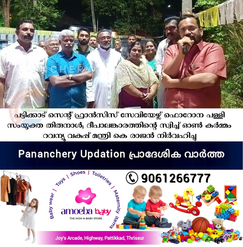 പട്ടിക്കാട് സെൻറ് ഫ്രാൻസിസ് സേവിയേഴ്സ് ഫൊറോന പള്ളിയിൽ വിശുദ്ധ സെബസ്ത്യാനോസിന്റെയും പരിശുദ്ധ കന്യകാമറിയത്തിന്റെയും വിശുദ്ധ ഫ്രാൻസിസ് സേവ്യർ ന്റെയും തിരുനാൾ മഹാമഹം 2024 ജനുവരി 27 ,28 തീയതികളിൽ തിരുകർമ്മങ്ങൾക്ക് വികാരി ഫാ ജിജോ വള്ളൂപ്പാറ നേതൃത്വം നൽകും .എല്ലാദിവസവും നോവനേയും ലദീഞ്ഞും ദിവ്യബലിയും ഉണ്ടായിരിക്കും 26ന് വൈകിട്ട് 7. 30ന് ദീപാലങ്കാരം സ്വിച്ച് ഓൺ കർമ്മം റവന്യൂ വകുപ്പ്മന്ത്രി കെ രാജൻ നിർവഹിച്ചു പാണഞ്ചേരി പഞ്ചായത്ത് പ്രസിഡന്റ് രവീന്ദ്രൻ പങ്കെടുത്തു. 27ന് ശനിയാഴ്ച രാവിലെ 6 30ന് അമ്പ്,തിരുസ്വരൂപം എഴുന്നുള്ളിപ്പും വൈകിട്ട് 10ന് അമ്പ് പ്രദീക്ഷണ സമാപനവും 28ന് ഞായറാഴ്ച രാവിലെ 10ന് ആഘോഷമായ തിരുനാൾ പാട്ടു കുർബാനയും വൈകിട്ട് 4 30ന് തിരുനാൾ പ്രദീക്ഷണവും തുടർന്ന് ബാൻഡ് മേളം, മ്യൂസിക്കൽ ഫ്യൂഷൻ എന്നിവ ഉണ്ടായിരിക്കുന്നതാണ്. കൺവീനർ അജീഷ് പുത്തൻപുരയ്ക്കൽ. ഡെയ്സൺ വട്ടേക്കാട്ടുക്കര. ജോൺസൺ ചാലയ്ക്കൻ,ബിജു നീലങ്കാവിൽ , നിബിൾ നിക്സൺ,കമ്മിറ്റി അംഗങ്ങൾ, കൈകാരന്മാർ നേതൃത്വം നൽകും