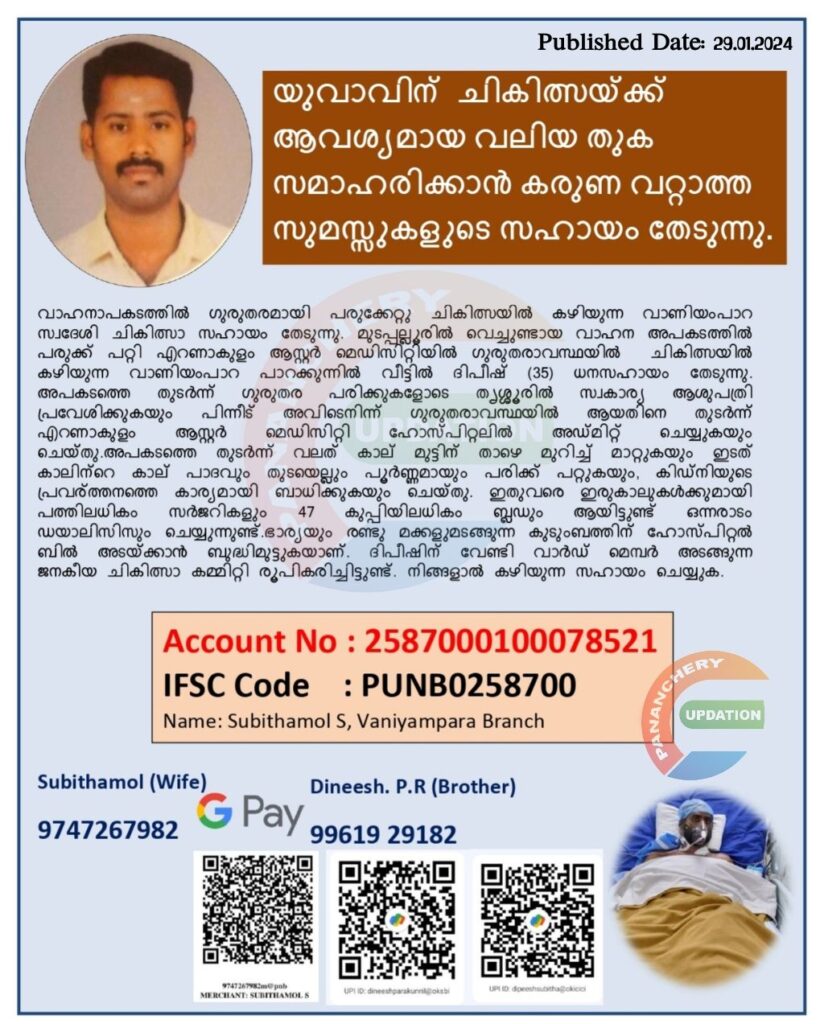 യുവാവിന്റെ ചികിത്സയ്ക്ക് ആവശ്യമായ വലിയ തുക സമാഹരിക്കാൻ കരുണ വറ്റാത്ത സുമസ്സുകളുടെ സഹായം തേടുന്നു .