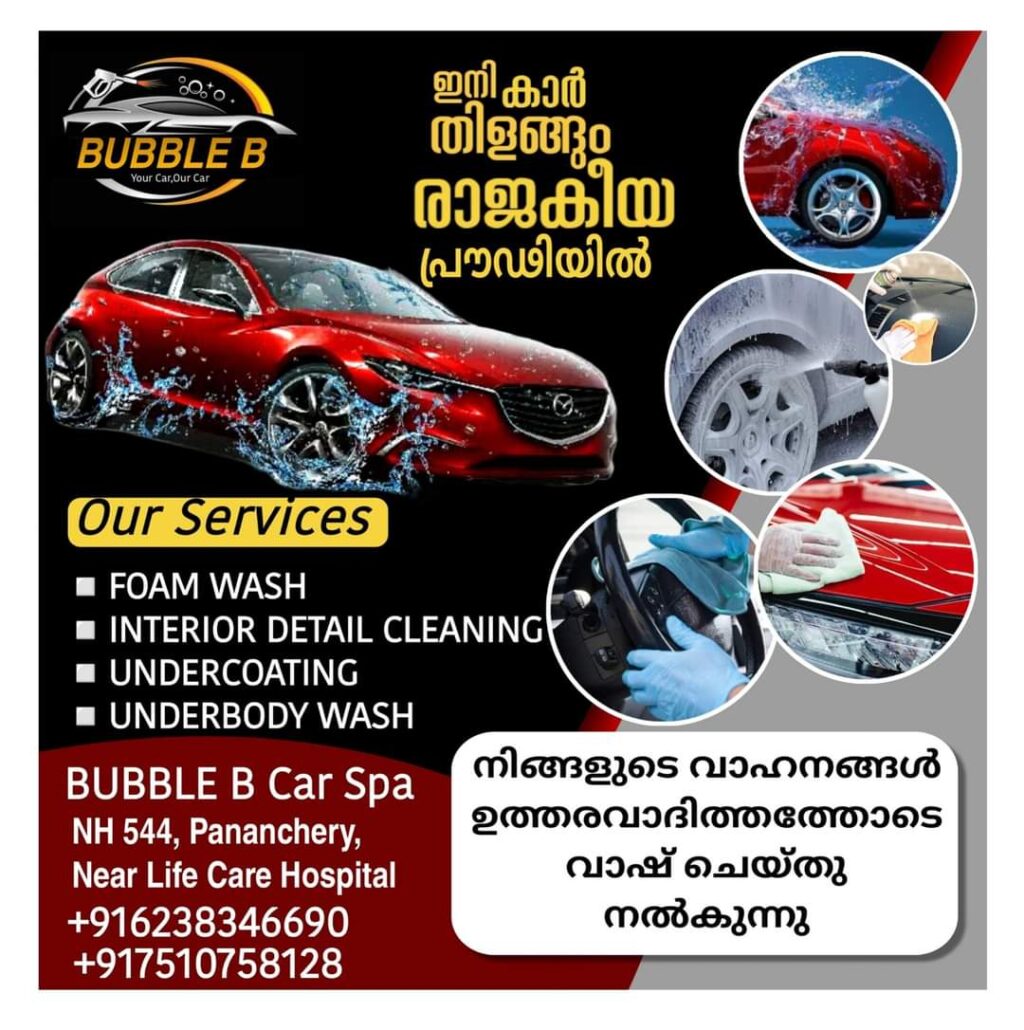 അത്യാധുനിക മിഷനറികളും വിദഗ്ധരുടെ സേവനങ്ങളും പ്രയോജനപ്പെടുത്തികൊണ്ട് BUBBLE B Car Spa പാണഞ്ചേരിയിൽ ലൈഫ് കെയർ ഹോസ്പിറ്റലിനു സമീപം ഉദ്ഘാടനം ചെയ്ത് പ്രവർത്തനം ആരംഭിച്ചു.