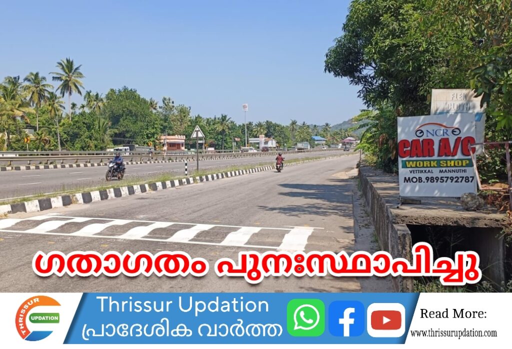 ഇന്ന് കാലത്ത് 8 മണിയോടുകൂടിയാണ് മണ്ണൂത്തി വെട്ടിക്കലിനും ഡോൺ ബോസ്ക്കോ സ്കൂളിനും ഇടയിൽ മണൽ കയറ്റി വന്ന ടിപ്പർ സ്വകാര്യ വ്യക്തിയുടെ പറമ്പിലേക്ക് മണൽ അടിക്കുന്നതിനായി കയറ്റിയപ്പോഴാണ് റോഡിന് കുറുകെ സർവീസ് റോഡിലെ കാനയിൽ താഴ്ന്നത്. ഇതിനെ തുടർന്ന് വെട്ടിക്കലിലും മുളയം റോഡിലും ഏർപ്പെടുത്തിയിരുന്ന ഗതാഗത നിയന്ത്രണം രണ്ടു മണിയോടുകൂടി ടിപ്പർ മാറ്റി ഗതാഗതം പുനസ്ഥാപിച്ചു