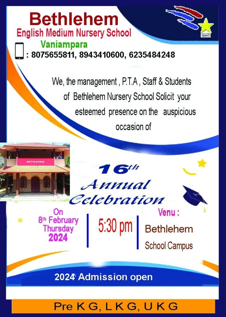 We, the management, P.T.A, Staff & Students of Bethlehem Nursery School Solicit your esteemed presence on the auspicious occasion of