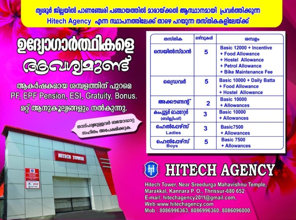 തൃശൂർ ജില്ലയിൽ പാണഞ്ചേരി പഞ്ചായത്തിലെ മാരായ്ക്കൽ ആസ്ഥാനമായി പ്രവർത്തിക്കുന്ന Hitech Agency എന്ന സ്ഥാപനത്തിലേക്ക് താഴെ പറയുന്ന തസ്തികകളിലേക്ക് ഉദ്യോഗാർത്ഥികളെ ആവശ്യമുണ്ട്.👇