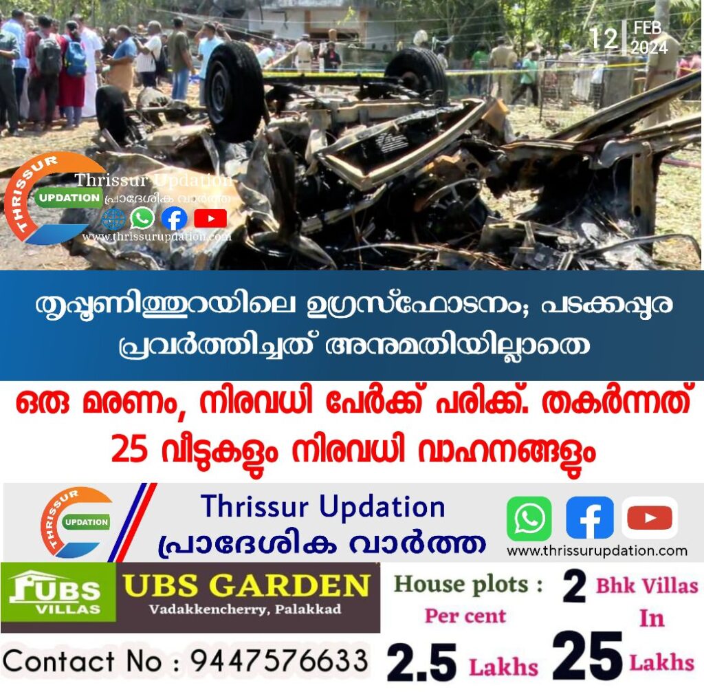 തൃപ്പൂണിത്തുറയിൽ ഒരാളുടെ മരണത്തിനിടയാക്കിയ സ്ഫോടനം നടന്ന പടക്കശേഖരണശാല പ്രവർത്തിച്ചിരുന്നത് അനുമതിയില്ലാതെയെന്ന് അഗ്നിരക്ഷാസേന. സ്ഫോടനത്തിൽ രണ്ട് വാഹനങ്ങൾ കത്തിനശിക്കുകയും സമീപത്തെ 25-ഓളം വീടുകൾക്ക് ഗുരുതരമായ കേടുപാടുകൾ പറ്റുകയും ചെയ്തിട്ടുണ്ട്.വീടുകൾ തിങ്ങിനിറഞ്ഞ ഇത്തരം മേഖലകളിൽ പടക്കക്കടയോ പടക്കനിർമാണശാലകളോ പടക്കശേഖരണശാലകളോ പ്രവർത്തിക്കാൻ പാടില്ലെന്നാണ് നിയമമെന്നും തൃപ്പൂണിത്തുറ ഫയർ ആന്റ് റെസ്ക്യു അസിസ്റ്റന്റ് സ്റ്റേഷൻ ഓഫീസർ പറയുന്നു. ‘സ്ഫോടനം നടന്ന സ്ഥലത്തിന് അരകിലോമീറ്റർ അകലെയാണ് അഗ്നിരക്ഷാസേനയുടെ ഓഫീസുള്ളത്. സ്ഫോടനശബ്ദം കേട്ടയുടൻ ഉദ്യോഗസ്ഥരുമായി സംഭവസ്ഥലത്തേക്ക് പുറപ്പെടുകയായിരുന്നു. ശബ്ദംകേട്ട ഭാഗത്തേക്കാണ് വണ്ടിവിട്ടത്. സംഭവസ്ഥലത്ത് എത്തുമ്പോൾ തീ സമീപത്തെ കടകളിലേക്കും പടർന്ന അവസ്ഥയിലായിരുന്നു’, രക്ഷാപ്രവർത്തനത്തിന് നേതൃത്വംനൽകിയ അസിസ്റ്റന്റ് സ്റ്റേഷൻ ഓഫീസർ പറഞ്ഞു.