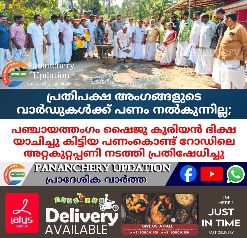 പാണഞ്ചേരി ഗ്രാമപഞ്ചായത്തിൽ വിലങ്ങന്നൂർ വാർഡ് മെമ്പർ ഷൈജു കുരിയന്റെ നേതൃത്വത്തിലാണ് ആളുകളിൽനിന്ന് ഭിക്ഷ യാചിച്ചു കിട്ടിയ പണം കൊണ്ട് റോഡ് നന്നാക്കി സഞ്ചാരയോഗ്യമാക്കുന്നത്. പഞ്ചായത്തിലെ തന്നെ പ്രധാന റോഡായ വിലങ്ങന്നൂർ – ചെന്നായ്പാറ റോഡ് നാളുകളായി തകർന്നു കിടക്കുകയാണ്.റോഡിൻ്റെ വിലങ്ങന്നൂർ വാർഡിന് പുറത്തുള്ള ഭാഗങ്ങൾ പുനർ നിർമാണത്തിന് തുക അനുവദിച്ചപ്പോൾ പ്രതിപക്ഷ അംഗങ്ങളുടെ വാർഡുകൾക്ക് പണം നൽകാതെ പഞ്ചായത്ത് ഭരിക്കുന്ന എൽ.ഡി.എഫും മന്ത്രി കെ. രാജനും പക്ഷപാതപരമായി പെരുമാറുന്നുവെന്ന് ആരോപിച്ചാണ് പഞ്ചായത്ത് അംഗത്തിന്റെ ഭിക്ഷാടനസമരം.
