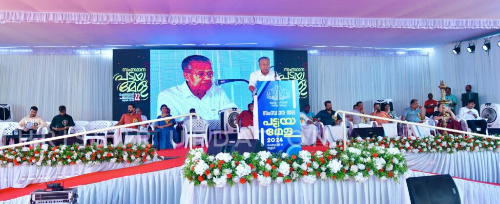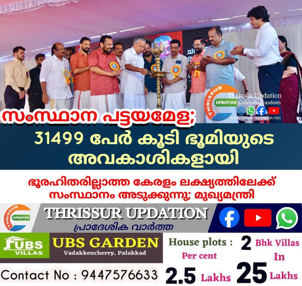 സംസ്ഥാനം ഭൂരഹിതരില്ലാത്ത കേരളം എന്ന ലക്ഷ്യത്തിലേക്ക് അടുക്കുകയാണെന്ന് മുഖ്യമന്ത്രി പിണറായി വിജയൻ. സംസ്ഥാന പട്ടയമേള ഉദ്ഘാടനം തേക്കിന്കാട് മൈതാനിയിലെ വിദ്യാര്ഥി കോര്ണറില് നിര്വഹിക്കുകയായിരുന്നു മുഖ്യമന്ത്രി.