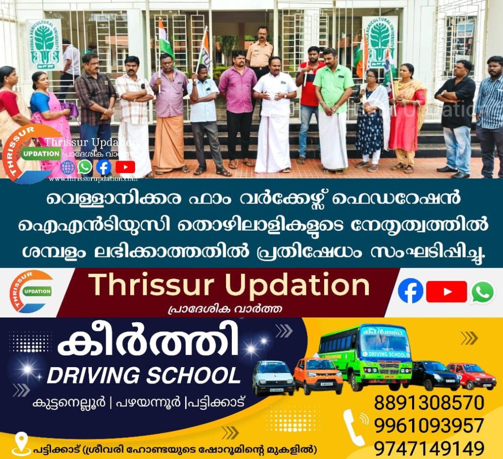 വെള്ളാനിക്കര ഫാം വർക്കേഴ്സ് ഫെഡറേഷൻ ഐഎൻടിയുസി തൊഴിലാളികളുടെ നേതൃത്വത്തിൽ ശമ്പളം ലഭിക്കാത്തതിൽ പ്രതിഷേധിച്ച് സർവ്വകലാശാല ആസ്ഥാനത്തിന് മുന്നിൽ പ്രതിഷേധം സംഘടിപ്പിച്ചു. യൂണിയൻ പ്രസിഡന്റ് അനു ഹംസ അധ്യക്ഷത വഹിച്ചു. കോൺഗ്രസ് ജില്ലാ കമ്മിറ്റി അംഗം കെ സി അഭിലാഷ് പ്രതിഷേധം ഉദ്ഘാടനം ചെയ്തു. സാങ്കേതിക തടസങ്ങൾ മൂലം സർക്കാർ ജീവനക്കാർക്ക് ശമ്പളം മുൻപ് മുടങ്ങിയിട്ടുണ്ടെങ്കിലും സർക്കാരിന്റെ കൈയിൽ പണമില്ലാത്തതിനാൽ ശമ്പളം നൽകാനാകാത്തത് രൂക്ഷമായ സാമ്പത്തിക പ്രതിസന്ധിയുടെ സൂചനയാണ് എന്നും ഈ ശമ്പള പ്രതിസന്ധി സമാനതകളില്ലാത്ത ആശങ്കകളിലേക്ക് ആണ് കേരളത്തെ കൊണ്ട് പോകുന്നത് എന്നും ഉദ്ഘാടന പ്രസംഗത്തിൽ കെ സി അഭിലാഷ് ആരോപിച്ചു.