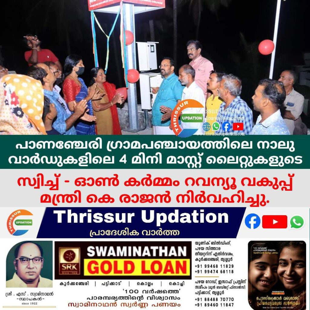 പാണഞ്ചേരി ഗ്രാമപഞ്ചായത്തിലെ നാലു വാർഡുകളിലായി 4 മിനി മാസ്റ്റ് ലൈറ്റുകളുടെ സ്വിച്ച് – ഓൺ കർമ്മം റവന്യൂ വകുപ്പ് മന്ത്രി കെ രാജൻ നിർവഹിച്ചു. ‘നിലാവുറങ്ങാത്ത ഒല്ലൂർ’ പദ്ധതിയുടെ ഭാഗമായാണ് ലൈറ്റുകൾ സ്ഥാപിച്ചത്. മയിലാട്ടുംപാറ നദിക്കര ക്ഷേത്രം, കണ്ണാറ കേന്ദ്രപ്പടി, ആൽപ്പാറ കനാൽ പുറം, ചിറക്കുന്ന് ശാന്തി ലൈൻ എന്നിവിടങ്ങളിലാണ് ലൈറ്റുകൾ സ്ഥാപിച്ചത്. പഞ്ചായത്ത് പ്രസിഡൻ്റ് പി പി രവീന്ദ്രൻ അധ്യക്ഷനായി. ബ്ലോക്ക് പഞ്ചായത്ത് വൈസ് പ്രസിഡൻ്റ് ഫ്രാൻസീന ഷാജു, സ്വപ്ന രാധാകൃഷ്ണൻ, രേഷ്മ സതീഷ്, ശൈലജ വിജയകുമാർ, രാഷ്ട്രീയകക്ഷി പ്രതിനിധികൾ തുടങ്ങിയവർ പങ്കെടുത്തു.