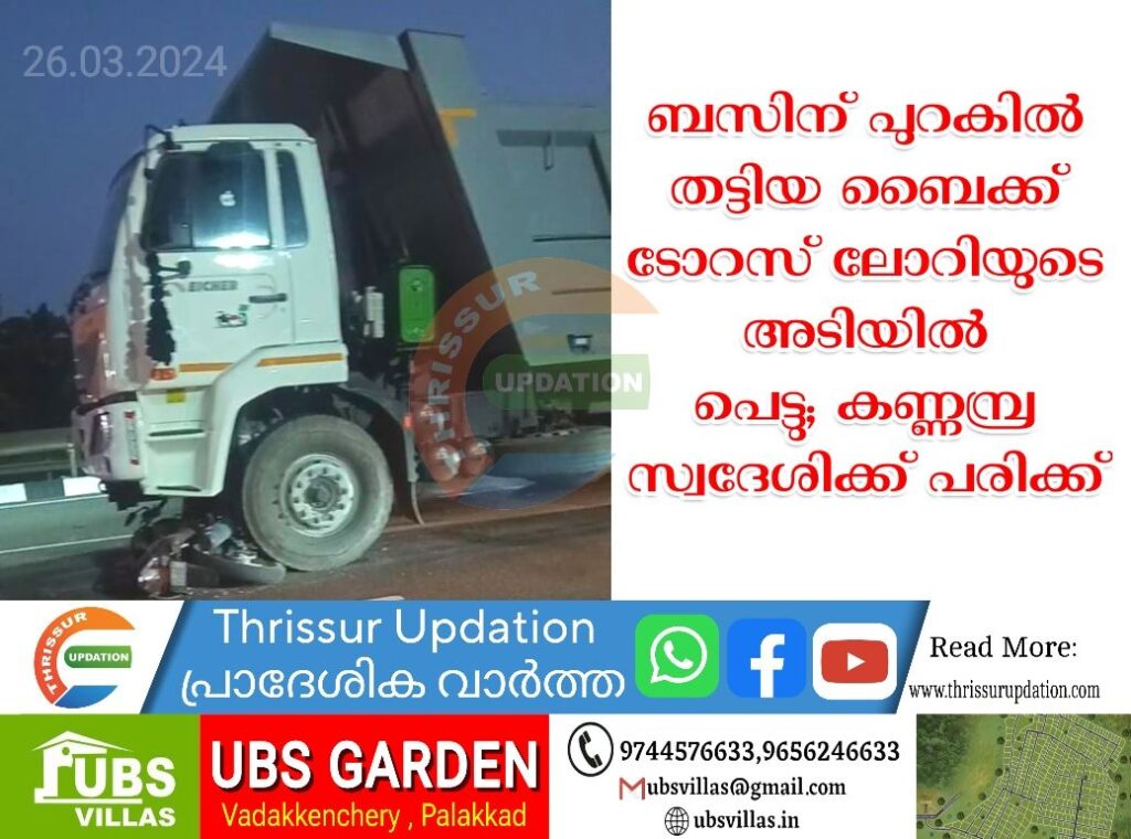 ബസിന് പുറകിൽ തട്ടിയ ബൈക്ക് ടോറസ് ലോറിയുടെ അടിയിൽ പെട്ടു; കണ്ണമ്പ്ര സ്വദേശിക്ക് പരിക്ക്