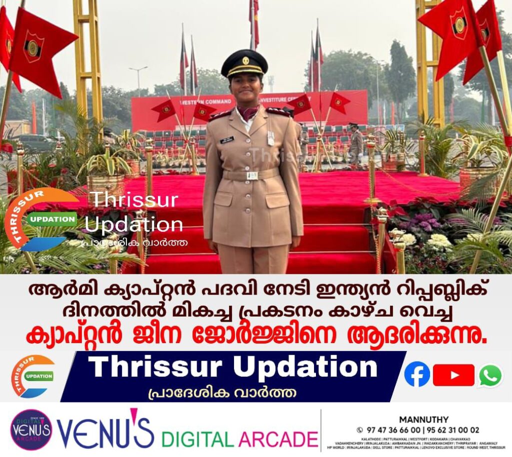 ആർമി ക്യാപ്റ്റൻ പദവി നേടി ഇന്ത്യൻ റിപ്പബ്ലിക് ദിനത്തിൽ ശ്രദ്ധേയമായ പ്രകടനം കാഴ്ച വച്ച കെ.കെ.ജോർജ്ജിൻ്റെ മകൾ ജീന ജോർജിനെ (നെഴ്സിങ്ങ് ഓഫീസർ) ഇന്ന് (27-03-2024 -ബുധൻ) വൈകീട്ട് 5 മണിക്ക് നെട്ടിശ്ശേരിയിലെ അക്ഷയ സ്ട്രീറ്റിലുള്ള സ്വവസതിയിൽ വെച്ച് ആദരിക്കുന്നു. ചടങ്ങിൽ മുൻ സ്പീക്കർ അഡ്വ. തേറമ്പിൽ രാമകൃഷ്ണൻ, മുൻ എം.എൽ.എ ടി.വി.ചന്ദ്രമോഹൻ, മുൻ മേയർ ഐ.പി.പോൾ തുടങ്ങിയവർ പങ്കെടുക്കുന്നു. ഏവർക്കും സ്വാഗതം