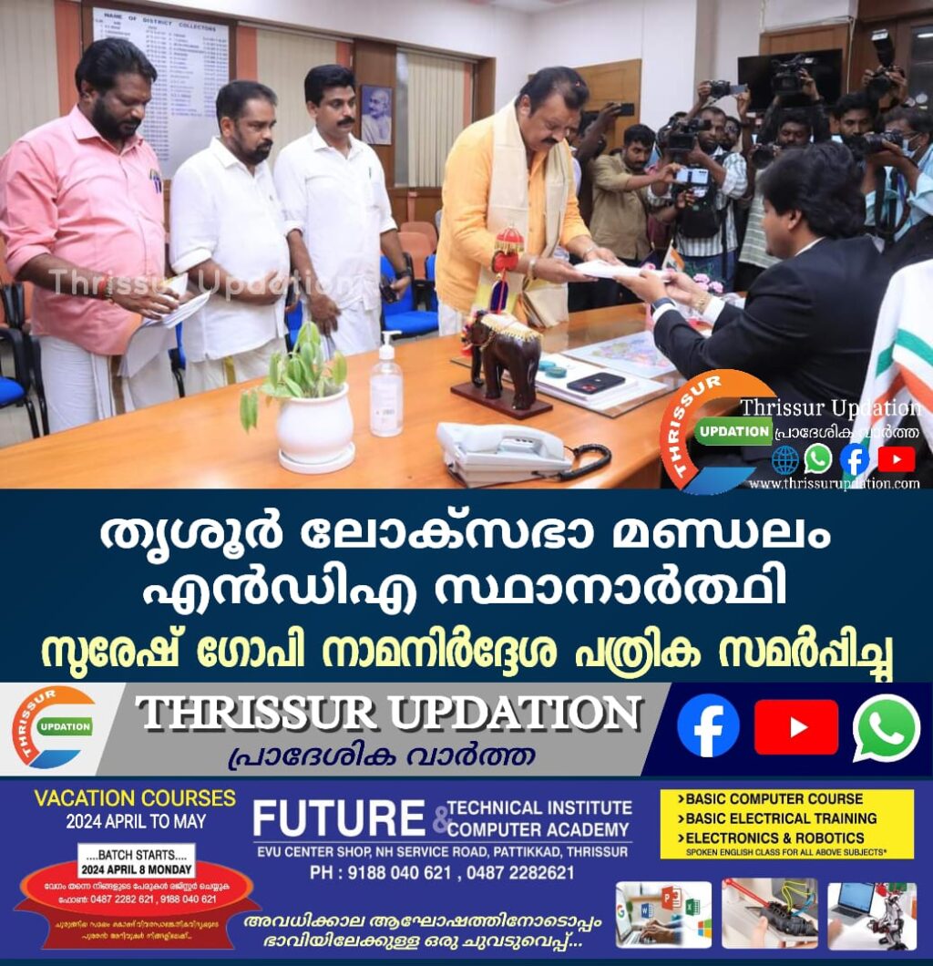 തൃശൂർ എൻഡിഎ സ്ഥാനാർത്ഥി സുരേഷ് ഗോപി നാമനിർദേശ പത്രിക സമർപ്പിച്ചു. അയ്യന്തോൾ അമർ ജവാൻ ജ്യോതിയിൽ പുഷ്പാർച്ചന നടത്തിയ ശേഷമാണ് പത്രിക സമർപ്പിക്കാനെത്തിയത്. തൃശൂർ ലോകസഭ മണ്ഡലത്തിലെ തീരദേശ മത്സ്യത്തൊഴിലാളികളാണ് സുരേഷ് ഗോപിക്കായി കെട്ടിവെക്കാനുള്ള തുക നൽകിയത്. രാവിലെ പാറമേക്കാവ് ക്ഷേത്രത്തിലും സുരേഷ് ഗോപി ദർശനം നടത്തിയിരുന്നു.