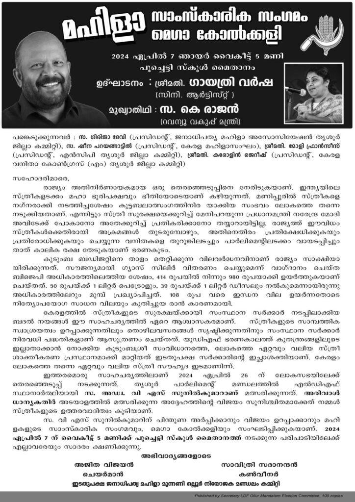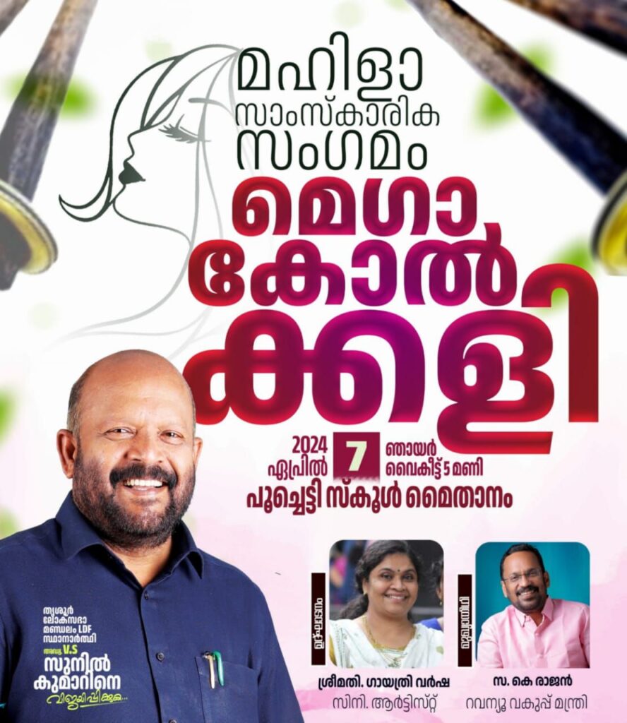 മഹിളാ സാംസ്കാരിക സംഗമം മെഗാ കോൽക്കളി നാളെ (2024 ഏപ്രിൽ 7 ഞായർ) വൈകീട്ട് 5 മണിക്ക് പൂച്ചെട്ടി സ്കൂൾ മൈതാനത്തിൽ സംഘടിപ്പിക്കുന്നു. പരിപാടിയുടെ ഉദ്ഘാടനം ഗായത്രി വർഷ (സിനി. ആർട്ടിസ്റ്റ് ) നിർവഹിക്കുന്നു.