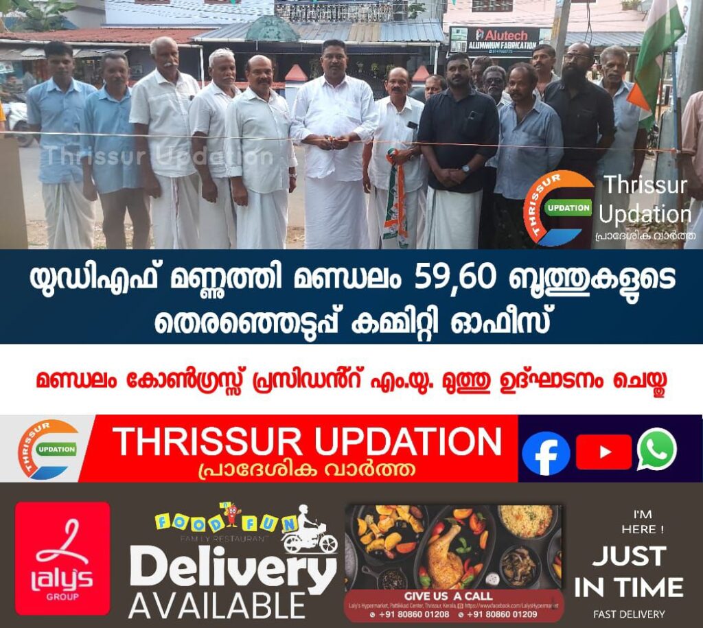 യു.ഡി.എഫ് സ്ഥാനാർത്ഥി കെ.മുരളീധരൻ്റെ മണ്ണുത്തി മണ്ഡലം ബൂത്ത് 59,60 ബൂത്ത് കമ്മിറ്റി കളുടെ തെരഞ്ഞെടുപ്പ് കമ്മറ്റി ഓഫീസ് മണ്ഡലം കോൺഗ്രസ്സ് പ്രസിഡൻ്റ് എം.യു. മുത്തു ഉദ്ഘാടനം ചെയ്തു. ബൂത്ത് പ്രസിഡൻ്റ് ജോണി അരിബൂർ അദ്ധ്യക്ഷത വഹിച്ചു.നേതാക്കളായ ബേബി പാലോലിയ്ക്കൽ ജോസ് പുലിക്കോട്ടിൽ ,എൻ.എസ്സ് നൗഷാദ് , എൻ.എം.ചന്ദ്രൻ ,പി .വി.ഹരിദാസ് ,സി.വി.സുമേഷ്, വിശ്വഭരൻ മുല്ലക്കര ,ജോയ് കെ.ജി ,ജോസ് പാറയ്ക്കൽ ,തുടങ്ങിയവർ പങ്കെടുത്ത് സംസാരിച്ചു