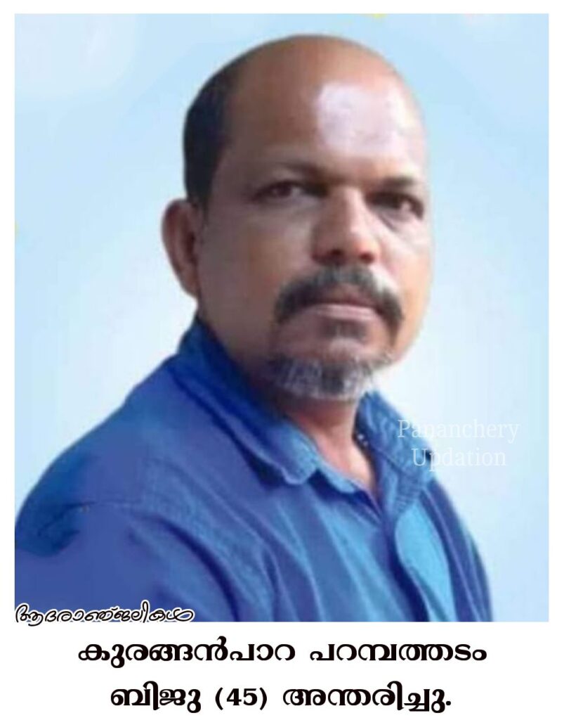 കുരങ്ങൻപാറ പറമ്പത്തടം കൊച്ചനിയൻ മകൻ ബിജു (45) അന്തരിച്ചു. സംസ്കാരം ഇന്ന് (16.04.2024 ചൊവ്വ) വൈകീട്ട് 3.00 മണിക്ക് വടക്കുംപാടം ആത്മാലയത്തിൽ