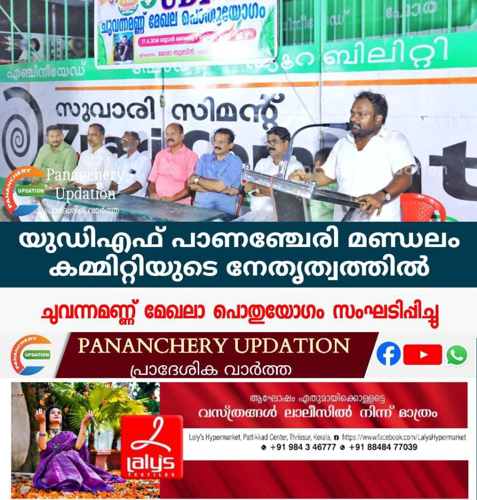 യുഡിഎഫ് പാണഞ്ചേരി മണ്ഡലം കമ്മിറ്റിയുടെ നേതൃത്വത്തിൽ ചുവന്നമണ്ണ് മേഖലാ പൊതുയോഗം സംഘടിപ്പിച്ചു. യുഡിഎഫ് മണ്ഡലം ചെയർമാൻ കെ പി ചാക്കോച്ചൻ അധ്യക്ഷത വഹിച്ചു. ഡിസിസി എക്സിക്യൂട്ടീവ് അംഗം കെ സി അഭിലാഷ് പൊതുയോഗം ഉദ്ഘാടനം ചെയ്തു. രാജ്യത്ത് വർഗീയത ആളിക്കത്തിച്ച് ഫാസിസ്റ്റ് ശൈലിയിലൂടെ പ്രധാനമന്ത്രി മോദിയും ബിജെപിയും ഭരണഘടനയെ പോലും അട്ടിമറിച്ചു കൊണ്ട് ഇന്ത്യൻ ജനാധിപത്യത്തെ വെല്ലുവിളിക്കുബോൾ കേരളത്തിൽ അഴിമതിയും ധൂർത്തും അടിച്ചമർത്തലും മുഖമുദ്രയാക്കി പിണറായി സർക്കാർ അധികാരം സ്വന്തം കുടുംബത്തിനും മക്കൾക്കും വേണ്ടി നിർലജ്ജം ഉപയോഗിക്കുന്നു എന്നത് നാം തിരിച്ചറിയണമെന്ന് ഉദ്ഘാടന പ്രസംഗത്തിൽ കെ സി അഭിലാഷ് ആരോപിച്ചു.