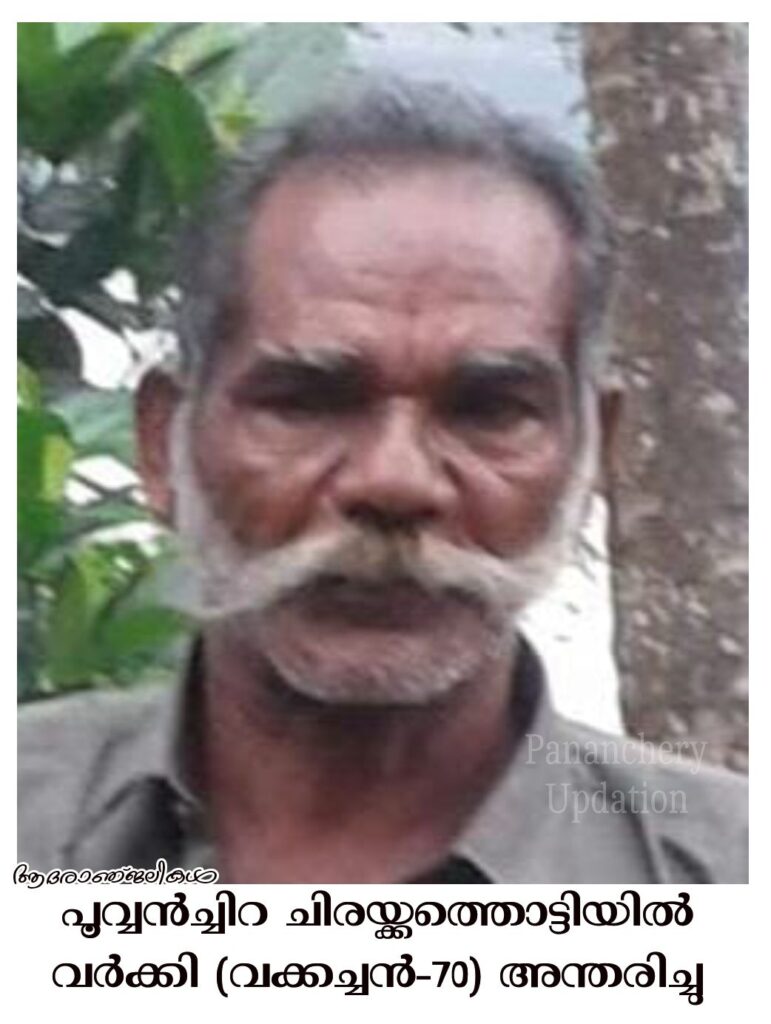 പൂവ്വൻച്ചിറ ചിരയ്ക്കത്തൊട്ടിയിൽ മാണി മകൻ വർക്കി (വക്കച്ചൻ-70) അന്തരിച്ചു. സംസ്കാരം ഇന്ന് (27.04.2024-ശനിയാഴ്ച) ഉച്ചകഴിഞ്ഞ് 3 മണിക്ക് ചുവന്നമണ്ണ് നിർമ്മലഗിരി സെൻ്റ് ജോസഫ് പള്ളിയിൽ. ഭാര്യ: തങ്കമ്മ. മക്കൾ: വിൽസൻ, വിൻസി. മരുമക്കൾ: പ്രിൻസി, ജോസ്.