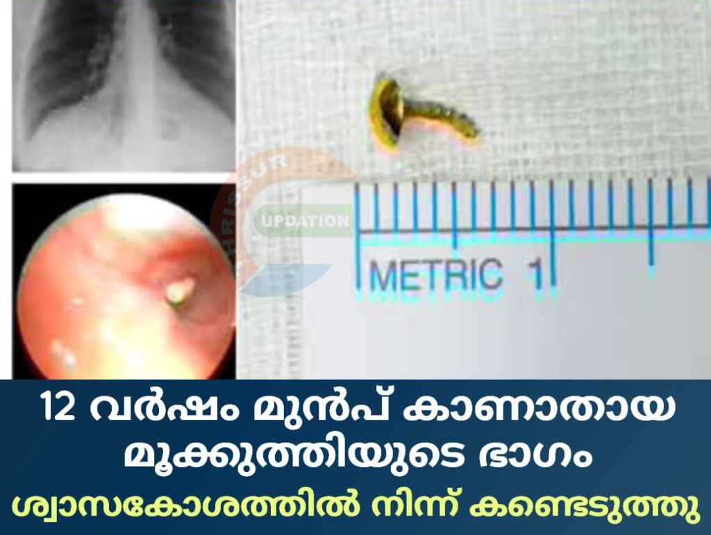 വർഷങ്ങളായി മാറാതെയുള്ള ശ്വാസ തടസത്തിന് പോം വഴി തേടിയെത്തിയ യുവതിയുടെ ശ്വാസകോശത്തിൽ നിന്ന് കണ്ടെത്തിയത് 12 വർഷം മുൻപ് കാണാതായ മൂക്കുത്തിയുടെ ചങ്കിരി. കൊല്ലം ശാസ്താംകോട്ട സ്വദേശിനിയായ 44കാരിയുടെ ശ്വാസകോശത്തിൽ നിന്നാണ് മൂക്കുത്തിയുടെ ഭാഗം കണ്ടെത്തിയത്. ഏകദേശം 1 സെന്റിമീറ്ററോളം വലുപ്പമുള്ള മൂക്കുത്തിയുടെ ഭാഗം അഴിഞ്ഞ് ശ്വാസകോശത്തിലേക്ക് പോവുകയായിരുന്നു.കൊച്ചി അമൃത ആശുപത്രിയിലെ ഇന്റർവെൻഷണൽ പൾമണോളജി വിഭാഗം മേധാവി ഡോ.ടിങ്കു ജോസഫിന്റെ നേതൃത്വത്തിൽ ശസ്ത്രക്രിയ കൂടാതെ ചങ്കിരി പുറത്തെടുത്തത്. 12 വർഷങ്ങൾക്കു മുമ്പാണ് വീട്ടമ്മയ്ക്ക് മൂക്കുത്തിയുടെ ചങ്കിരി നഷ്ടമായത്. മൂക്കുത്തിയുടെ പ്രധാനഭാഗം വീട്ടിൽ നിന്ന് കിട്ടിയെങ്കിലും ചങ്കിരി കിട്ടിയില്ല. ഇതിനായി വീട്ടിൽ ഏറെ തിരച്ചിൽ നടത്തിയെങ്കിലും കിട്ടാതായതോടെ മറ്റെവിടെയെങ്കിലും വീണ് പോയതാകാമെന്ന് വിചാരിച്ചിരിക്കുകയായിരുന്നു വീട്ടമ്മ.മറ്റൊരു ശസ്ത്രക്രിയയുമായി ബന്ധപ്പെട്ട് നടത്തിയ കഴിഞ്ഞ ആഴ്ച സ്കാനിംഗിലാണ് ശ്വാസകോശത്തിലെ അന്യ പദാർത്ഥം കണ്ടെത്തിയത്. തുടർന്ന് തുടർന്ന് വിദഗ്ധ ചികിത്സയ്ക്കായി കൊച്ചി അമൃത ആശുപത്രിയിലേക്കെത്തുകയായിരുന്നു. ഇവിടെ നടത്തിയ പരിശോധനയിൽ ഇത് മൂക്കുത്തിയുടെ ഭാഗമാണെന്ന് കണ്ടെത്തുകയും റിജിഡ് ബ്രോങ്കോസ്കോപിയിലൂടെ പുറത്തെടുക്കുകയുമായിരുന്നു. ഡോ.ശ്രീരാജ്, ഡോ.ടോണി എന്നിവരും ചികിത്സാ സംഘത്തിലുണ്ടായിരുന്നു.തൃശൂർ പാണഞ്ചേരി സ്വദേശി ലാലീസ് ഗ്രൂപ്പ് ഉടമ കാവനാകുടിയിൽ ഔസേപ്പിന്റെ മകനാണ് ഡോ. ടിങ്കു ജോസഫ്.