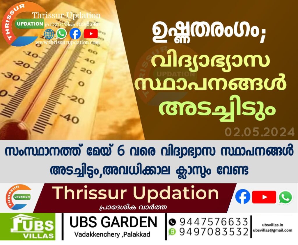 ചൂട് കൂടുന്ന സാഹചര്യത്തിൽ മേയ് ആറ് വരെ പ്രഫഷനൽ കോളജുകൾ ഉൾപ്പെടെയുള്ള വിദ്യാഭ്യാസ സ്ഥാപനങ്ങൾ അടച്ചിടും. ഉഷ്ണതരംഗ സാധ്യത വിലയിരുത്താൻ മുഖ്യമന്ത്രി പിണറായി വിജയന്റെ അധ്യക്ഷതയിൽ ചേർന്ന ദുരന്തനിവാരണ അതോറിറ്റിയുടെ യോഗത്തിലാണു തീരുമാനം. സ്കൂൾ വിദ്യാർഥികൾക്ക് അവധിക്കാല ക്ലാസുകൾ 11 മണി മുതൽ 3 മണിവരെ ഒഴിവാക്കാൻ നിർദേശം നൽകും. പൊലീസ്, അഗ്നിശമന രക്ഷാസേന, മറ്റ് സേനാവിഭാഗങ്ങൾ, എൻസിസി, എസ്പിസി തുടങ്ങിയവയുടെ പരിശീലന കേന്ദ്രങ്ങളിൽ പകൽ സമയത്തെ പരേഡും ഡ്രില്ലുകളും ഒഴിവാക്കും.ആസ്ബെസ്റ്റോസ്, ടിൻ ഷീറ്റുകൾ മേൽക്കൂരയായിട്ടുള്ള തൊഴിലിടങ്ങൾ പകൽ സമയം അടച്ചിടണം. ഇവ മേൽക്കൂരയായുള്ള വീടുകളിൽ താമസിക്കുന്ന അതിഥി തൊഴിലാളികൾ ഉൾപ്പെടെയുള്ളവരെ ക്യാംപുകളിലേക്ക് മാറ്റാനാവശ്യമായ സൗകര്യങ്ങൾ ജില്ലാ ഭരണകൂടം ഒരുക്കണം. മാർക്കറ്റുകൾ, കെട്ടിടങ്ങൾ, മാലിന്യശേഖരണ – നിക്ഷേപ കേന്ദ്രങ്ങൾ തുടങ്ങിയ തീപിടിത്ത സാധ്യതയുള്ള ഇടങ്ങളിൽ ഫയർ ഓഡിറ്റ് നടത്തി സുരക്ഷാ മുൻകരുതൽ സ്വീകരിക്കണം. ആശുപത്രികളുടെയും പ്രധാന സർക്കാർ സ്ഥാപനങ്ങളുടെയും ഫയർ ഓഡിറ്റ് സംസ്ഥാന ദുരന്തനിവാരണ അതോറിറ്റി പുറപ്പെടുവിച്ച മാനദണ്ഡം അനുസരിച്ച് പെട്ടെന്നുതന്നെ ചെയ്യണം.