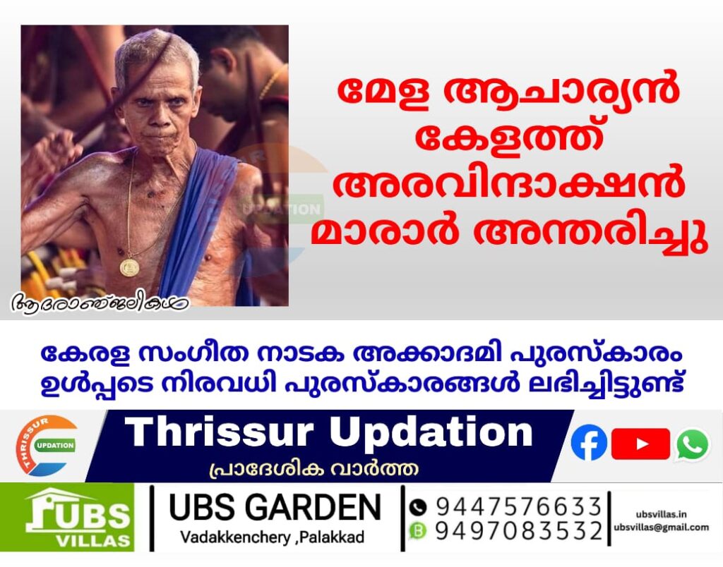 മേള ആചാര്യൻ കേളത്ത് അരവിന്ദാക്ഷൻ മാരാര് അന്തരിച്ചു. 83 വയസ്സായിരുന്നു. നാലു പതിറ്റാണ്ട് തൃശൂർ പൂരത്തിന്റെ ഭാഗമായിരുന്നു.ഇലഞ്ഞിത്തറ മേളത്തിൽ ദീർഘകാലം പെരുവനത്തിന്റെ വലം തലയായി നിന്നു. അച്ഛൻ മാക്കോത്ത് ശങ്കരൻ കുട്ടി മാരാരായിരുന്നു ഗുരു.പതിനാറാം വയസ്സിൽ തൃശൂർ പൂരത്തോടൊപ്പമുള്ള പ്രയാണം ആരംഭിച്ചു.എൺപതാം വയസ്സിൽ വാർധക്യ സഹജമായ ആരോഗ്യപ്രശ്നങ്ങളാൽ തൃശൂര് പൂരത്തിലെ മേളത്തില് നിന്നും സ്വയം പിന്വാങ്ങി. കേരള സംഗീത നാടക അക്കാദമി പുരസ്കാരം ഉൾപ്പടെ നിരവധി പുരസ്കാരങ്ങൾ ലഭിച്ചിട്ടുണ്ട്. അവിവാഹിതനായിരുന്നു