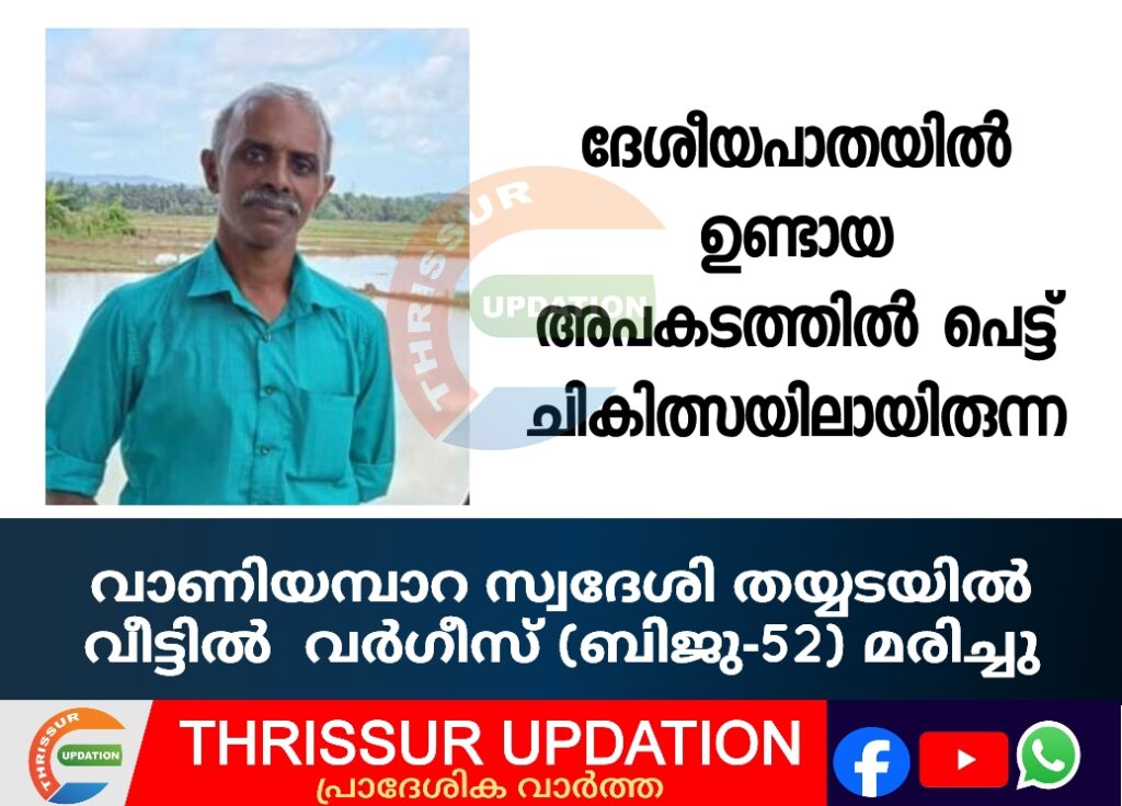 ദേശീയപാതയിൽ ഉണ്ടായ അപകടത്തിൽ പെട്ട് ചികിത്സയിലായിരുന്ന വാണിയമ്പാറ സ്വദേശി തയ്യടയിൽ വീട്ടിൽ വർഗീസ് (ബിജു-52) മരിച്ചു