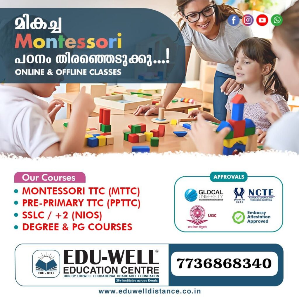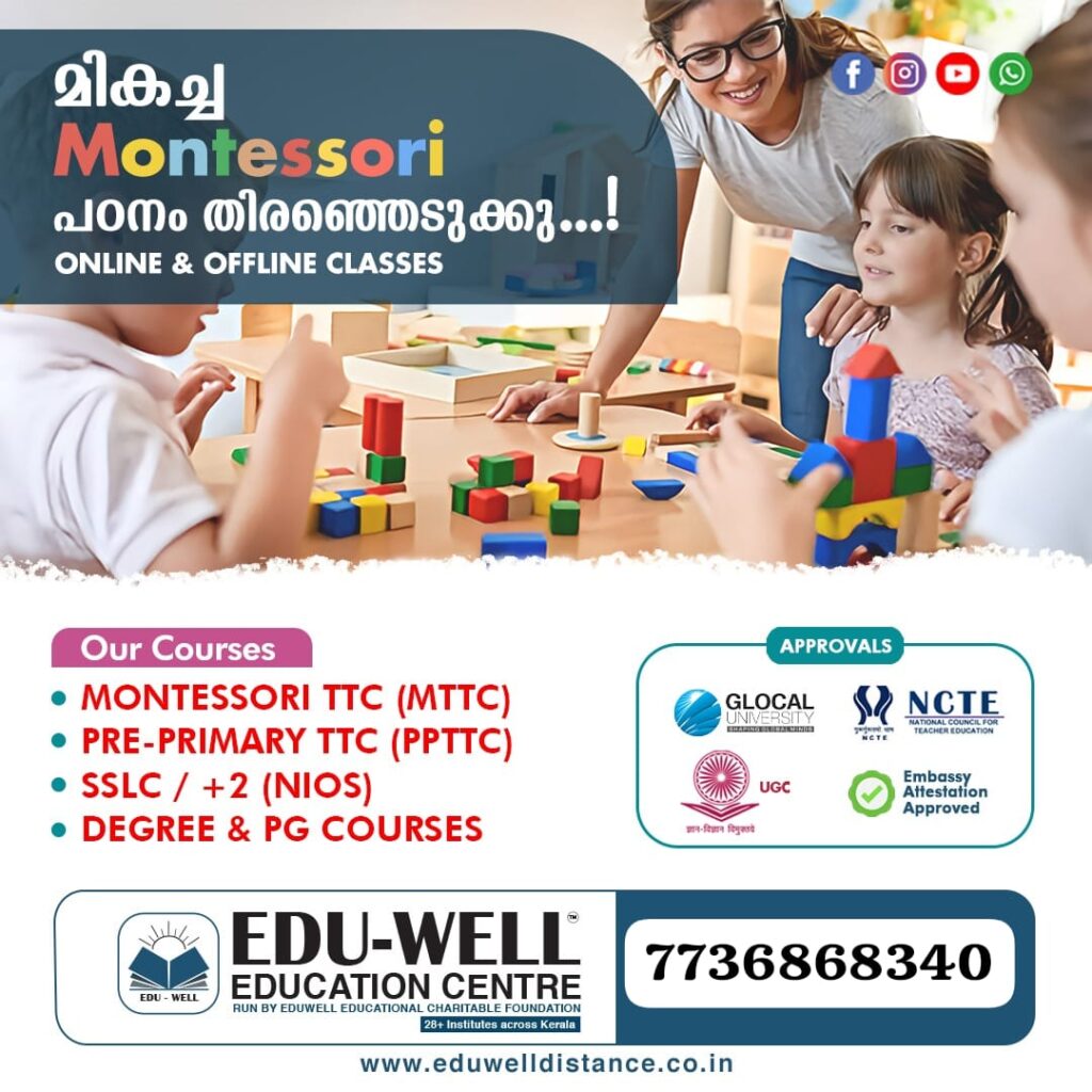 സ്വദേശത്തും വിദേശത്തും ടീച്ചിങ്ങ് മേഖലയിൽ വന് തൊഴിൽ അവസരങ്ങള് നല്കുന്ന മോണ്ടിസോറി TTC/ പ്രീ പ്രൈമറി TTC കോഴ്സുകളിലേക്ക്