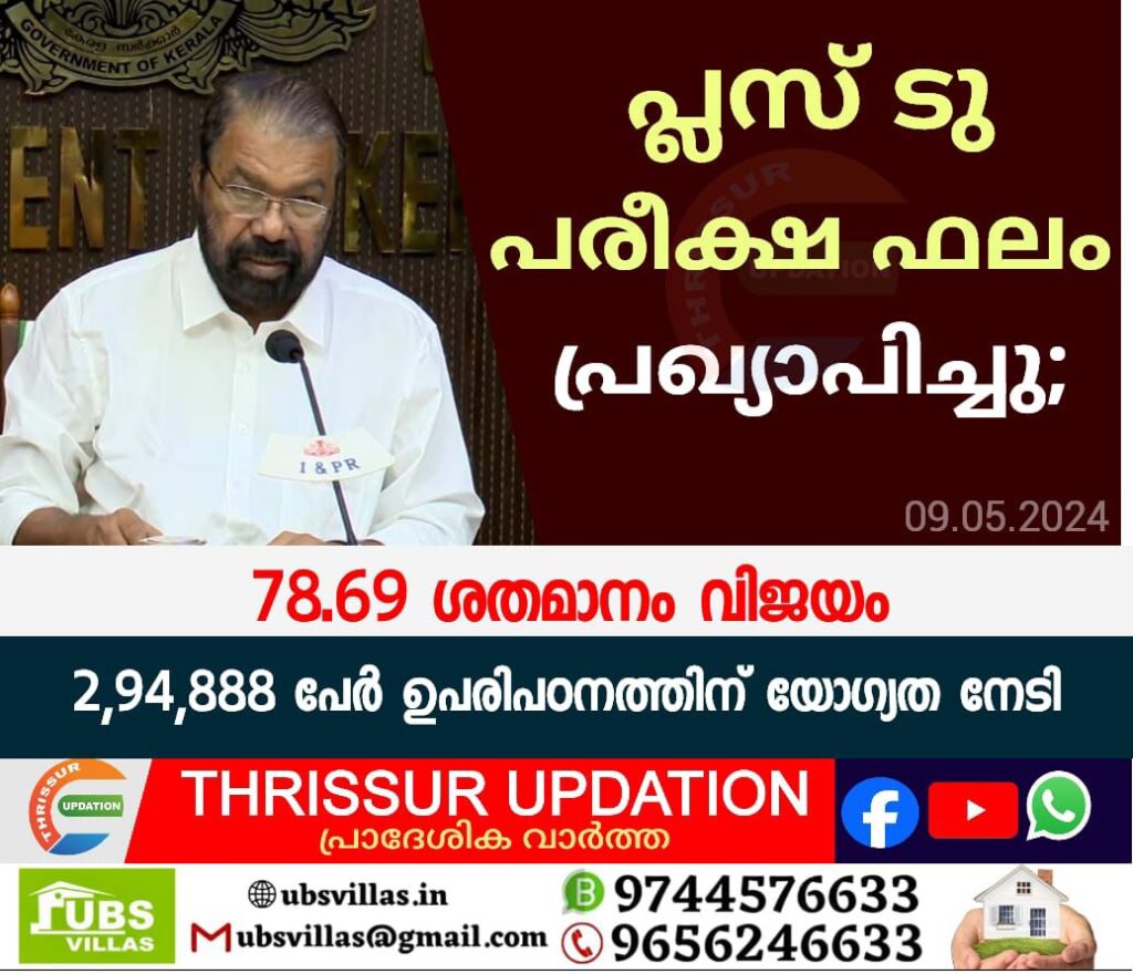 ഈ വർഷത്തെ ഹയര്സെക്കണ്ടറി, വൊക്കേഷണല് ഹയര് സെക്കണ്ടറി പരീക്ഷാ ഫലം പ്രഖ്യാപിച്ചു. വിദ്യാഭ്യാസമന്ത്രി വി ശിവൻകുട്ടിയാണ് ഫലപ്രഖ്യാപനം നടത്തിയത്. 78.69 ആണ് വിജയശതമാനം.4,41,120 വിദ്യാർത്ഥികളാണ് സംസ്ഥാനത്ത് പ്ലസ് ടു പരീക്ഷ എഴുതിയത്. ഇവരിൽ 2,94,888 പേർ ഉപരിപഠനത്തിന് യോഗ്യത നേടി വിഎച്ച്എസ്ഇ പരീക്ഷ എഴുതിയത് 29,300 വിദ്യാർത്ഥികളാണ്.സയൻസ് വിഭാഗത്തിൽ 84.84%, ഹ്യുമാനിറ്റീസ് 67.09%, കൊമേഴ്സ് 76.11% എന്നിങ്ങനെയാണ് വിജയശതമാനം. 4,41,120 വിദ്യാർത്ഥികളാണ് സംസ്ഥാനത്ത് പ്ലസ് ടു പരീക്ഷ എഴുതിയത്. ഇവരിൽ 2,94,888 പേർ ഉപരിപഠനത്തിന് യോഗ്യത നേടി. വിഎച്ച്എസ്ഇ പരീക്ഷ എഴുതിയത് 29,300 വിദ്യാർത്ഥികളാണ്. ജൂൺ 12 മുതൽ 20 വരെയാണ് ഇംപ്രൂവ്മെന്റ്, സേ പരീക്ഷകൾ നടക്കുക.
