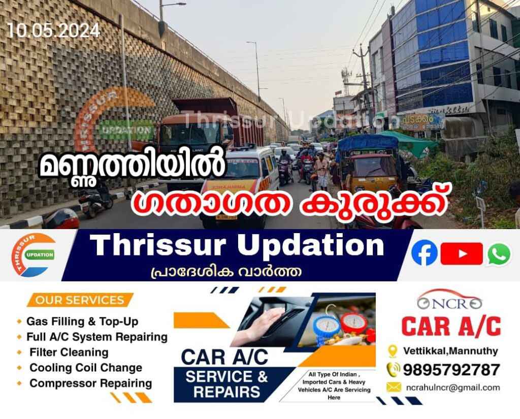 മണ്ണുത്തി സെൻറർ എത്തുന്നതിനു മുൻപ് സർവീസ് റോഡിൽ ടിപ്പർ ലോറി ബ്രേക്ക് ഡൌൺ ആയതിനെ തുടർന്ന് മണ്ണുത്തി ബൈപ്പാസ് വരെ ഗതാഗതകുരുക്ക് രൂപപ്പെട്ടു.പോലീസ് സംഭവ സ്ഥലത്ത് എത്തിയിട്ടുണ്ട്. വാഹനം മാറ്റി ഇടുന്നതിനുള്ള നടപടികൾ ആരംഭിച്ചു .തൃശ്ശൂരിൽ നിന്നും കിഴക്കുഭാഗത്തേക്ക് യാത്ര ചെയ്യുന്ന അത്യാവശ്യയാത്രക്കാർ മണ്ണുത്തി ബൈപ്പാസിൽ നിന്നും പാലം കയറി യാത്ര ചെയ്താൽ ബ്ലോക്ക് ഒഴിവാക്കാവുന്നതാണ്