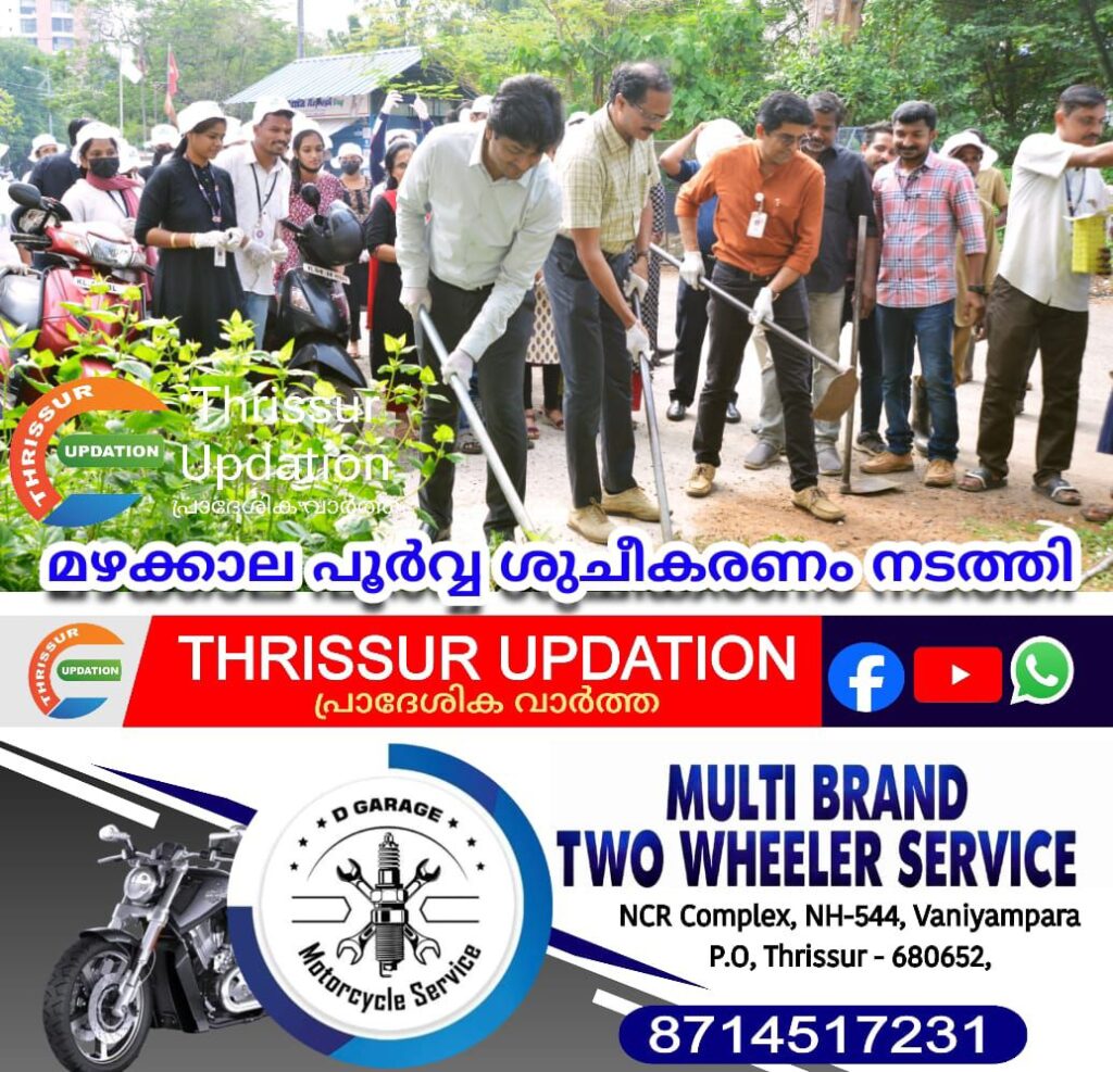 തൃശ്ശൂര് ജില്ലാ ശുചിത്വ മിഷന്റെയും ആരോഗ്യ വകുപ്പിന്റെയും നേതൃത്വത്തില് മഴക്കാല പൂര്വ്വ ശുചീകരണ പ്രവര്ത്തനങ്ങളുടെയും ദേശീയ ഡങ്കു ദിനാചരണത്തിന്റെയും ഭാഗമായി തൃശ്ശൂര് കളക്ടറേറ്റ് പരിസരത്ത് ശുചീകരണം നടത്തി. ജില്ലാ കളക്ടര് വി.ആര് കൃഷ്ണ തേജ പരിപാടി ഉദ്ഘാടനം ചെയ്തു. തദ്ദേശ സ്വയംഭരണ വകുപ്പ് ജോയിന്റെ ഡയറക്ടര് മുഹമ്മദ് ഷഫീഖ്, ശുചിത്വമിഷന് ജില്ലാ കോര്ഡിനേറ്റര് കെ.കെ മനോജ്, ഡെപ്യൂട്ടി ഡി.എം.ഒ ഡോ. സതീഷ്, മാസ് മീഡിയ ഓഫീസര് സന്തോഷ്, മാലിന്യമുക്ത നവകേരളം ജില്ലാ കോ-കോര്ഡിനേറ്റര് ബാബു കുമാര്, ശുചിത്വ മിഷന് പ്രോഗ്രാം ഓഫീസര് രജിനേഷ് രാജന്, അസി. കോര്ഡിനേറ്റര്മാരായ എം. മുര്ഷിദ്, സംഗീത്, ആര്.ജി.എസ്.എ കോര്ഡിനേറ്റര്മാര്, ശ്രീ കേരള വര്മ്മ കോളേജ്, പാറമേക്കാവ് കോളേജ് ഓഫ് ആര്ട്സ് ആന്ഡ് സയന്സ്, സെന്റ് തോമസ് കോളേജ് എന്നിവിടങ്ങളിലെ എന്എസ്എസ് വളണ്ടിയര്മാര്, കോര്പ്പറേഷന് ആരോഗ്യ വിഭാഗം ജീവനക്കാര്, കളക്ടറേറ്റിലെ വിവിധ വകുപ്പുകളിലെ ഉദ്യോഗസ്ഥര്, ജീവനക്കാര് തുടങ്ങിയവര് പങ്കെടുത്തു.