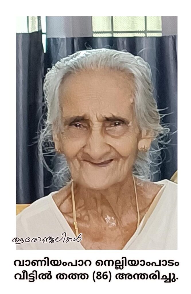 വാണിയംപാറ നെല്ലിയാംപാടം വീട്ടിൽ തത്ത (86) അന്തരിച്ചു . സംസ്ക്കാരം നാളെ (17.05.2024) ഉച്ചയ്ക്ക് 12 മണിക്ക് തിരുവില്വാമല ഐവർമഠത്തിൽ വെച്ച് .